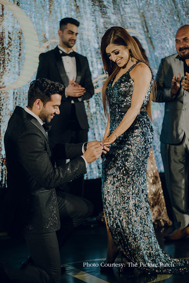 Boosting up the glamor stakes, the cocktail was a glitzy black-tie event where everyone turned up in their finest western attires. Surrounded by bright lights and crystal hangings under the dark star-studded sky, Sunny went down on his knee to declare his love for Dheera and slipped a stunning ring on her finger.