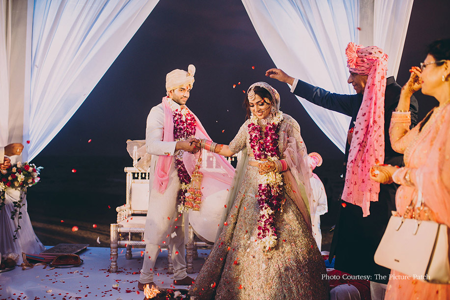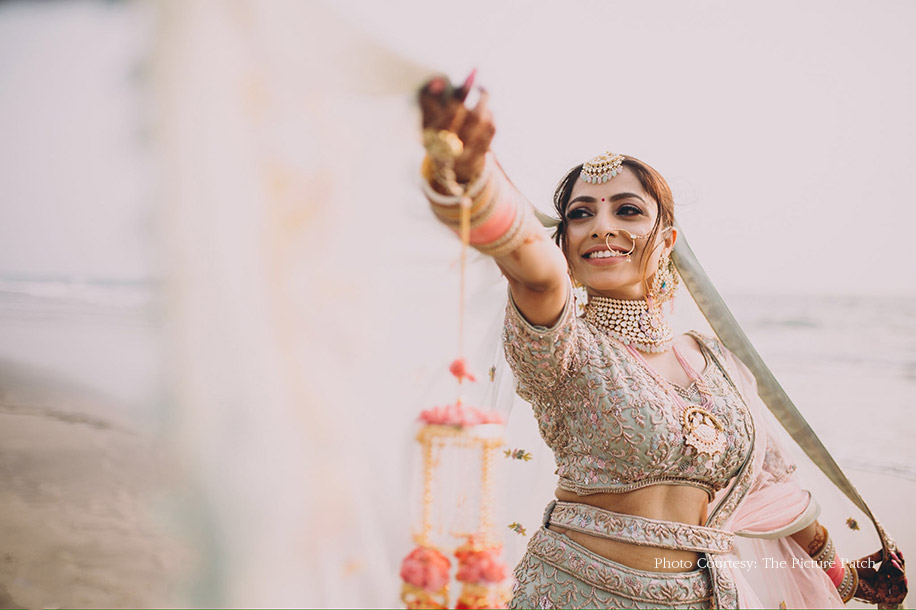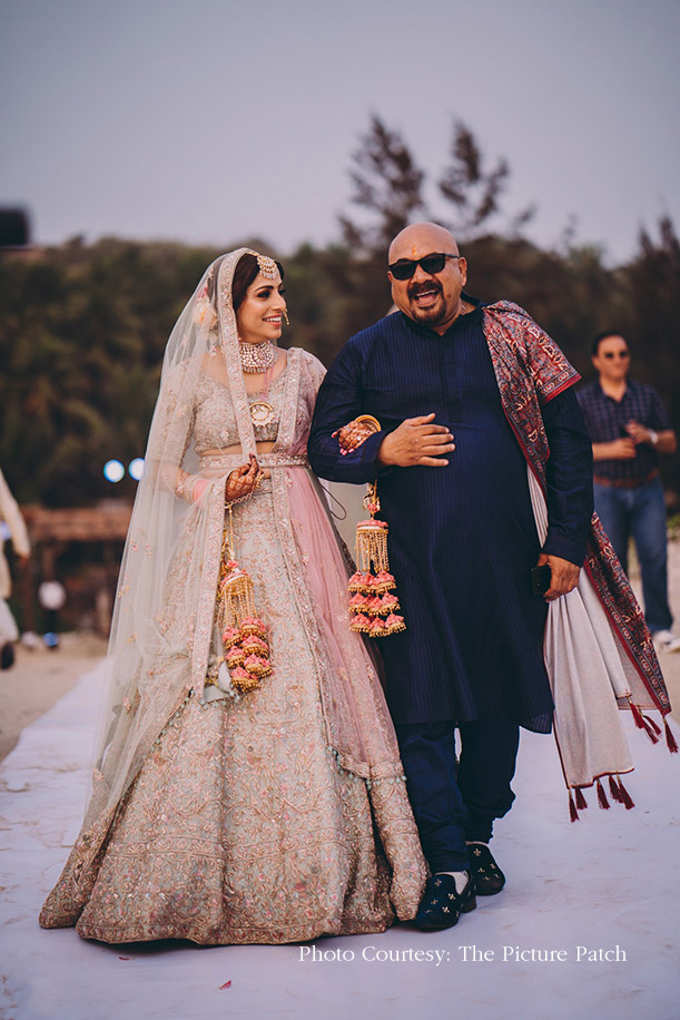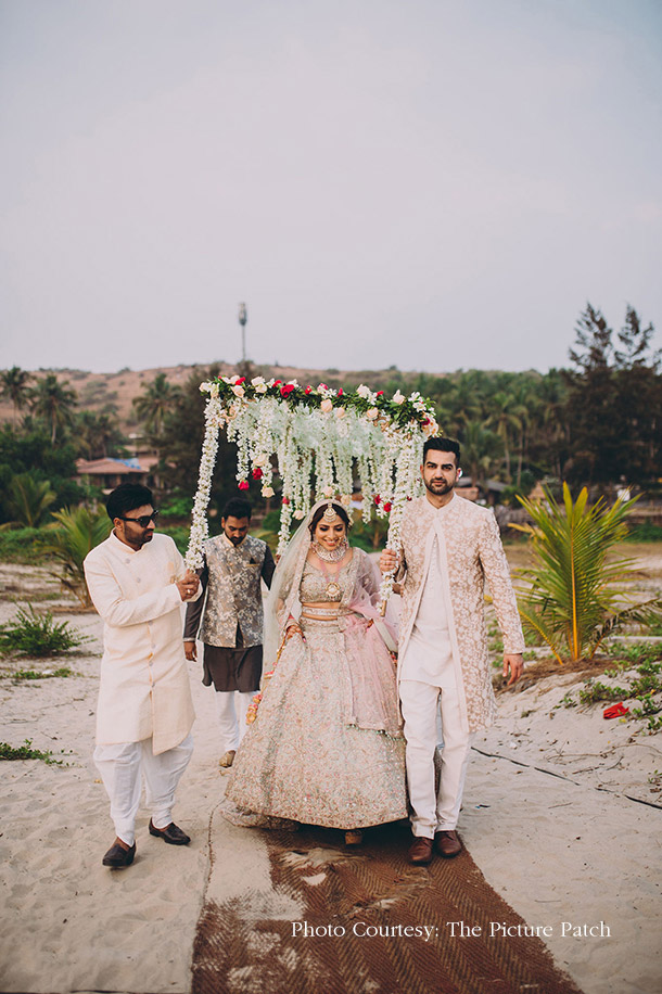 Held next to the crashing waves against the pristine golden sands, Dheera and Sunny’s wedding followed a pink, coral, and sea-green color palette. A perfectionist to the core, the bride started her planning a year in advance and ensured each detail was looked into with complete thoroughness. However, there wasn’t much to be worried about as she had a stellar team to fall back on who understood her vision completely. Keeping it classic and simple in order to highlight the scenic beauty of the beach, the decor was largely floral with blooms in muted pink and red tones. Set against the backdrop of the foamy waves, their mandap paired off white and gold hues seamlessly to give one an impression of the open sky.