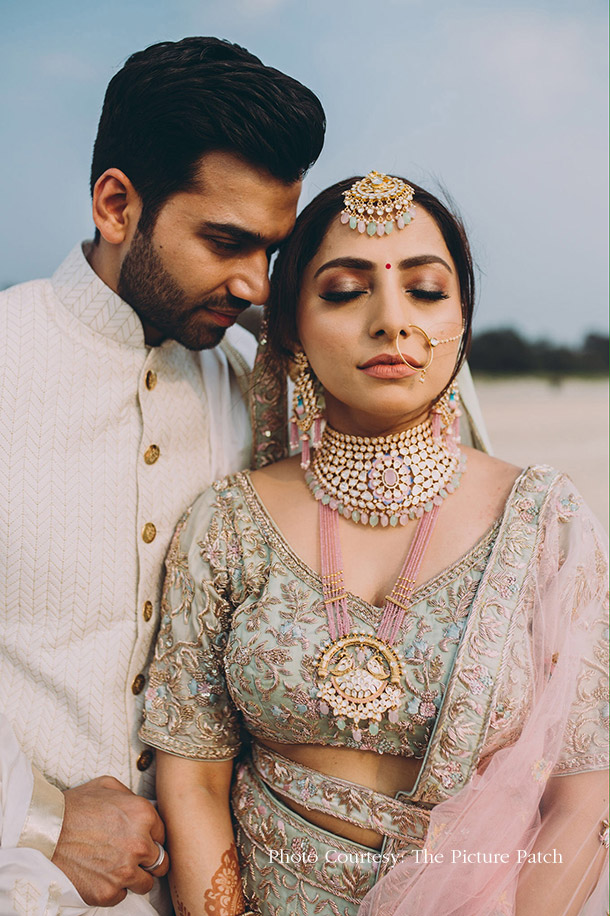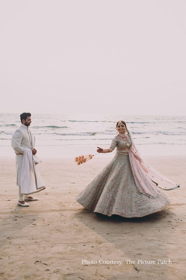Dressed in a light pink and mint lehenga, Dheera was a complete stunner as she ambled along the beach with Sunny who opted for a white sherwani.