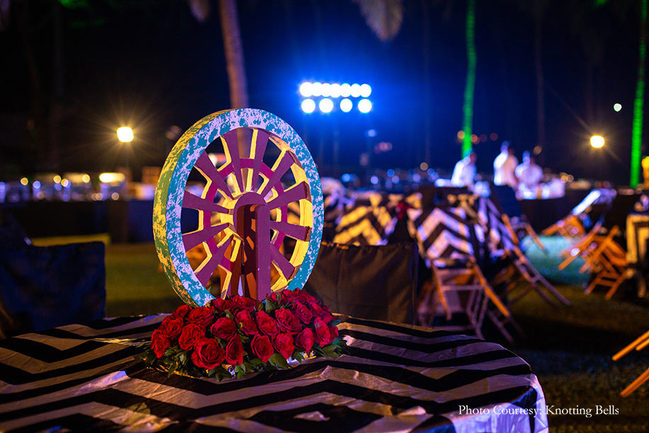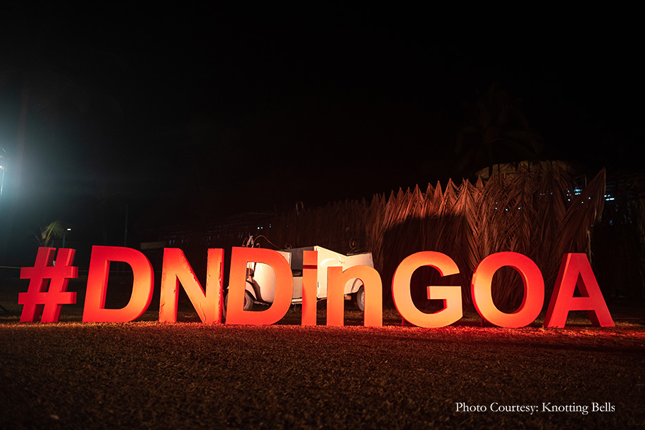 “Keeping things easy and light, we organized a relaxed pool party and brunch where our guests could chill to their heart’s content by playing life-sized games and indulge in some foot massages.” With pop art standees and multicolored canopies, this brunch not only satisfied the guests’ appetites but also rounded off the Goan experience. Dhruvi opted for comfort and chose a printed jumpsuit for this relaxed event, while Dhruven donned a beige blazer that he paired with casual white sneakers.