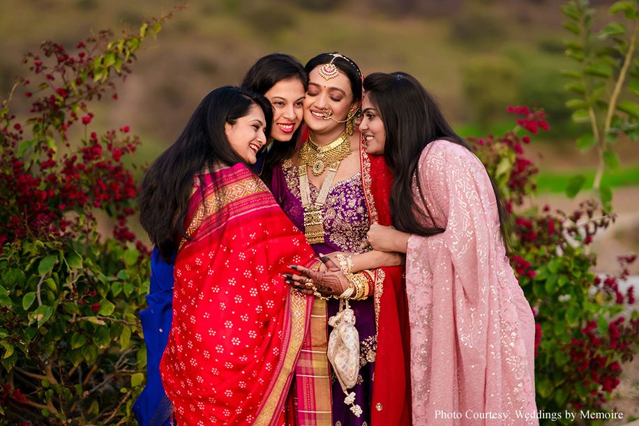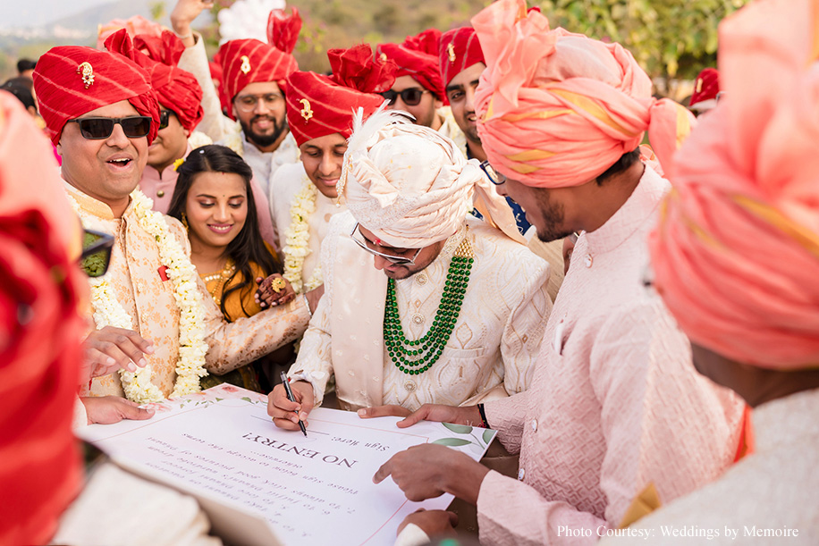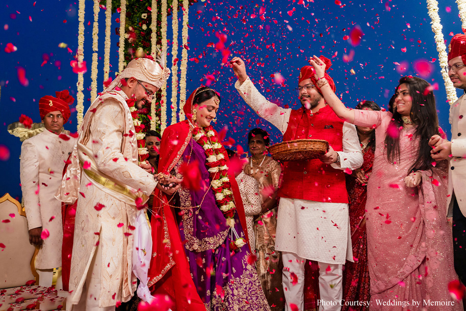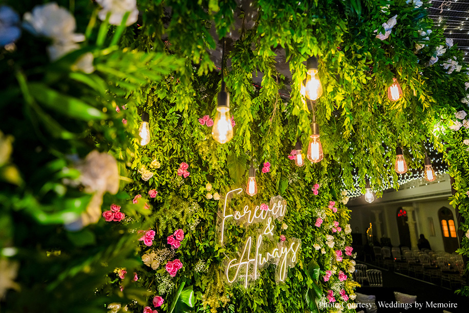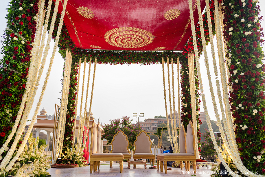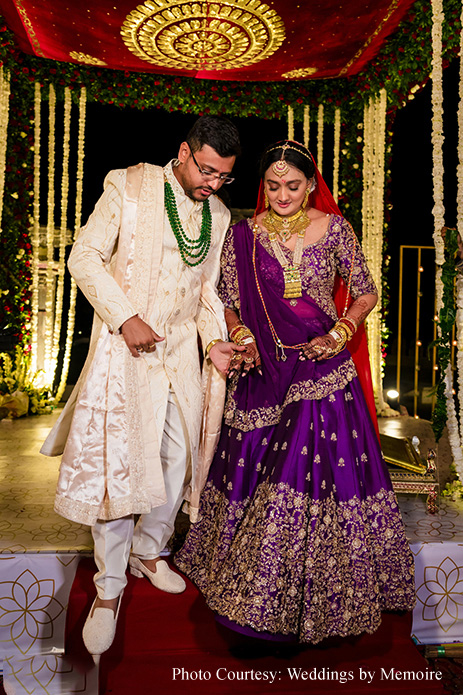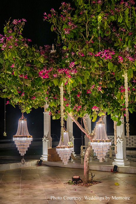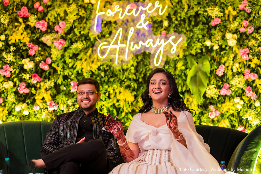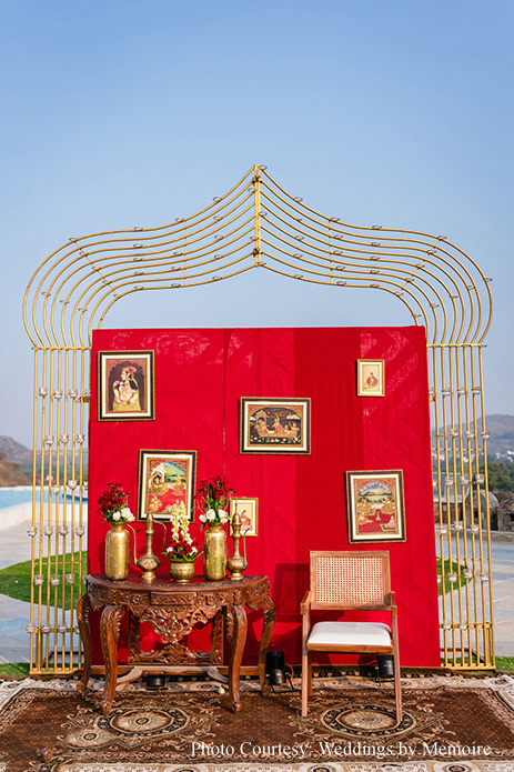 Dhwani shares, “We’d been waiting for this day with bated breath. After eight months of meticulous attention to detail, the planning team showcased their finely honed skills! Every moment seemed like a dream as we honored tradition and, at the same time, included a few unconventional rituals. Aash playfully signed a marriage contract with adorable promises while my bridal entry had everyone’s emotions running high. The varmala ceremony, set against a picturesque view was a sight to behold, capturing the essence of our love. Scarlet hues made the venue look ethereal while strategically placed white blooms, vintage wooden furnishings and brass elements gave a stunning contrast. In hindsight, everything was just perfect. The lighting, the decor and the flow of events.”