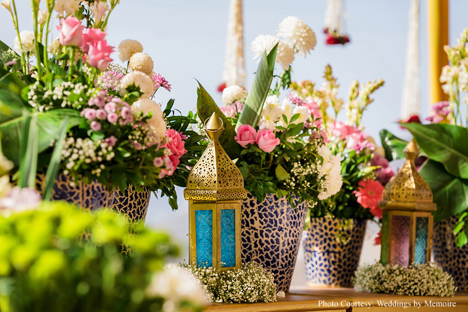 The Mehendi ceremony burst with colors featuring intricate Moroccan-themed décor that adorned every corner. Gilded lamps cast a glow over the festivities and fresh blooms filled the air with their exquisite fragrance. The event had everyone enthusiastically joining the activities, fostering closeness and camaraderie between the families.