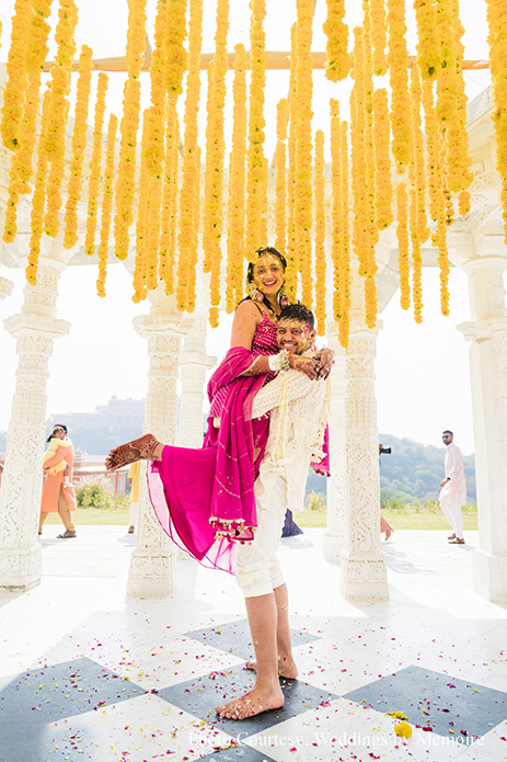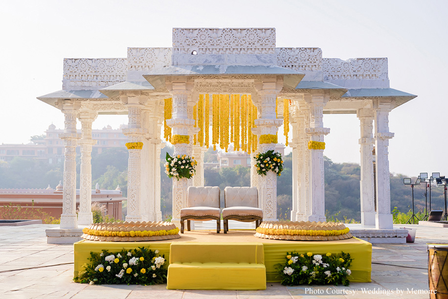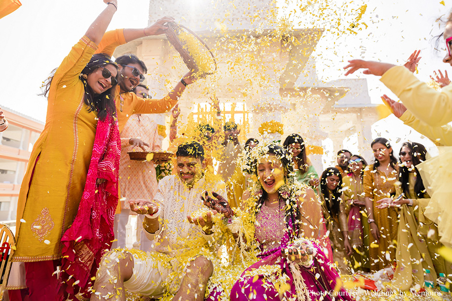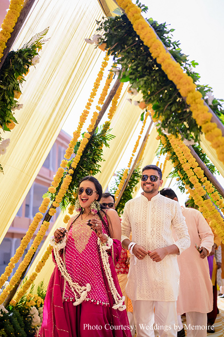 Dhwani and Aash share, “The Haldi ceremony was a joyful affair, bathed in hues of yellow and echoing with laughter. It was a time for our loved ones to come together, share stories, and bless us as we embarked on this journey of a lifetime. The decor with its array of marigold blooms and foliage looked gorgeous against the cerulean sky.”