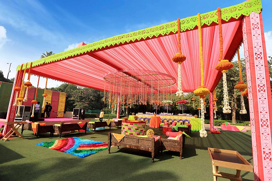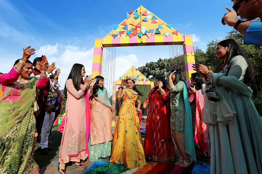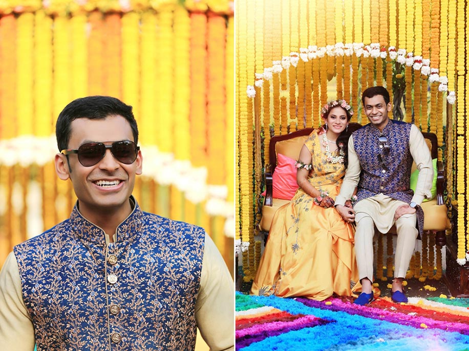 Our colorful mehndi was an ode to our friendship and the shared familial bond. We wanted bright decor to light up the beautiful Rani Bagh Lawns in Taj Palace. So we did and had fun games, nail art, caricature stalls, song, dance, food, drinks and lots of fun. We sure did have a carnival! I wore a beautiful sunset yellow lehenga-gown and floral accessories. Vaibhav looked every bit of a suave prince in his blue brocade sherwani.