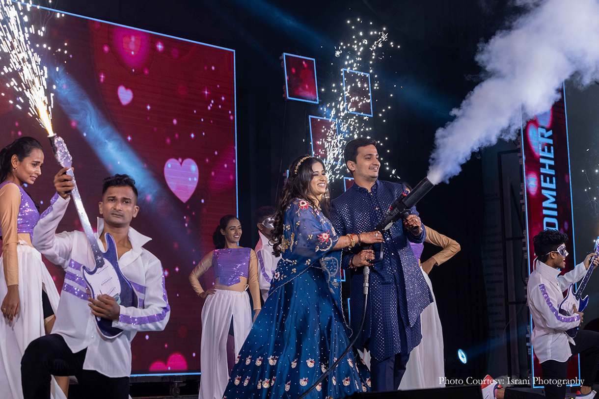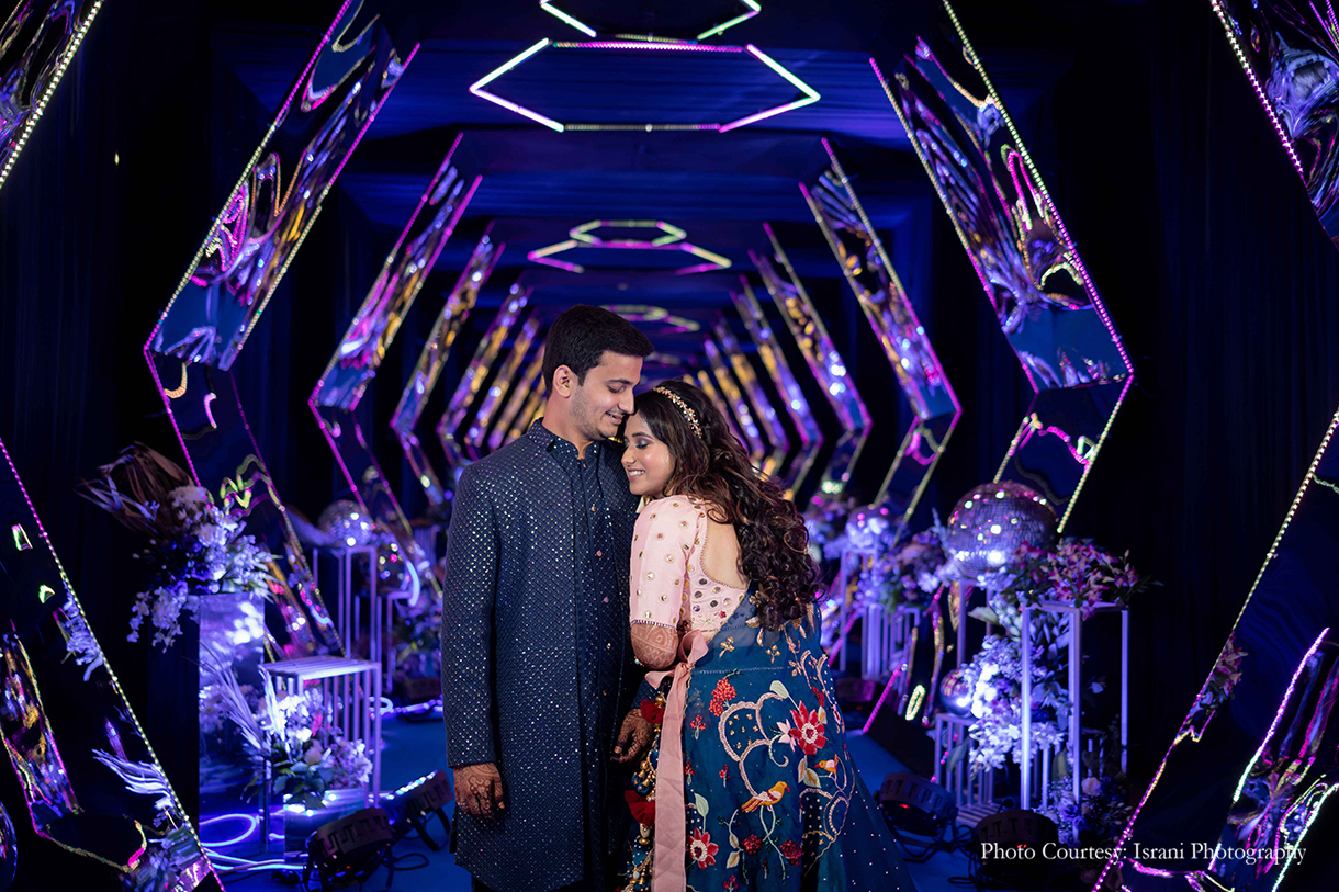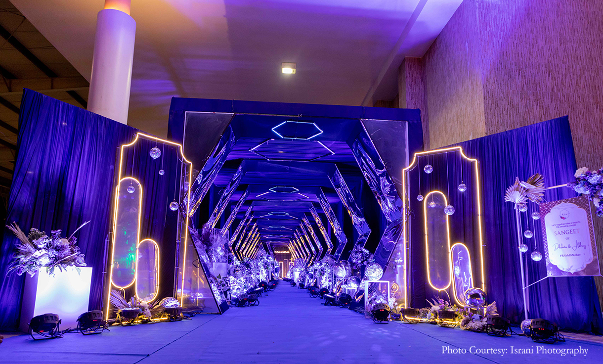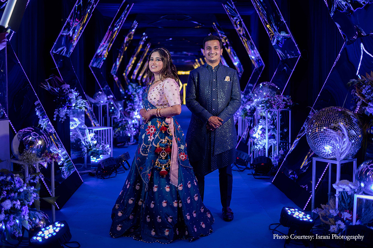 Himanshu shares, “The theme was ‘digitally yours’ and we did our best to amp up the glamour levels for the evening. After some amazing performances from the family, the couple entered in a stylish red car on stage in a grand fashion. Decorated with pampas grass, mirror work elements and LED lights – the venue exuded a dance-club-like vibe while staying elegant.”