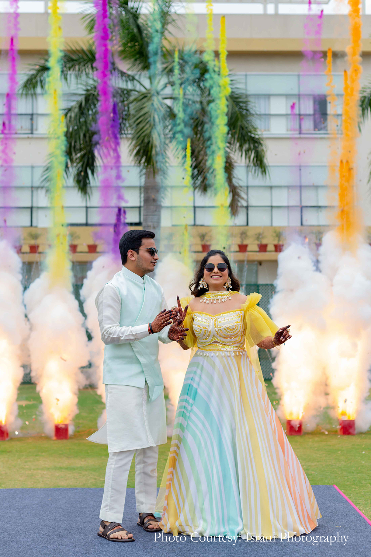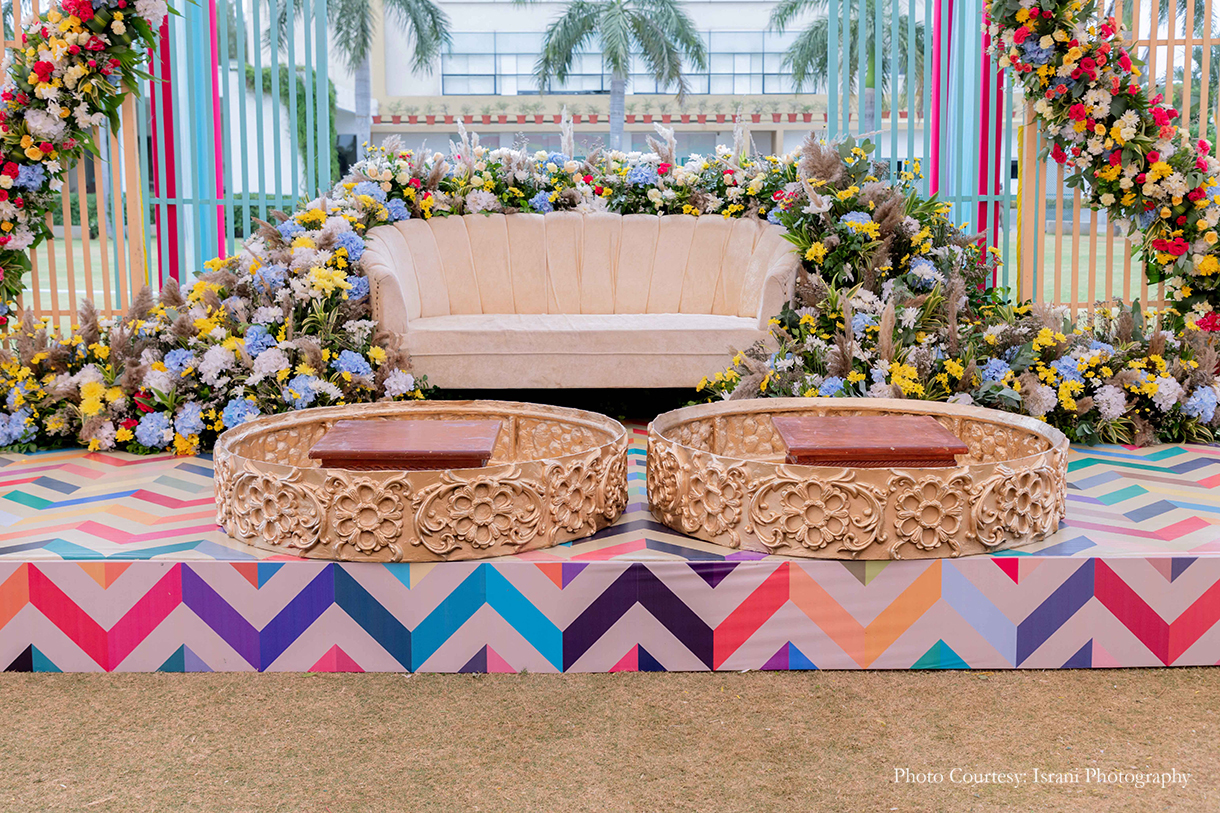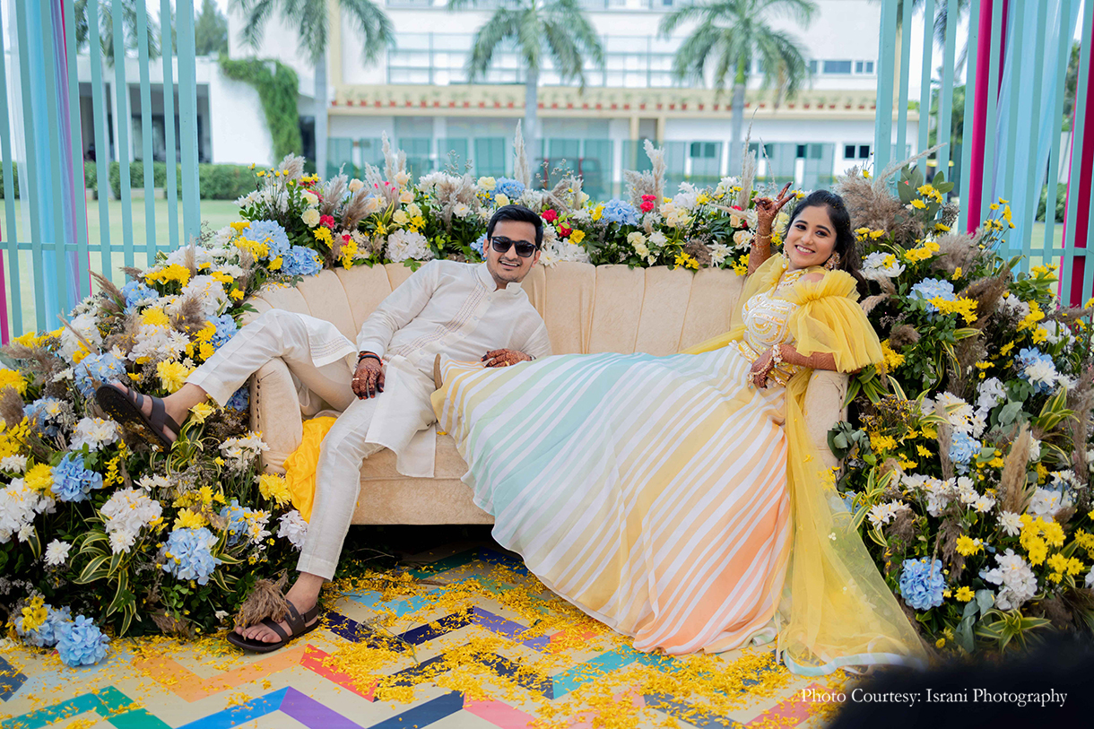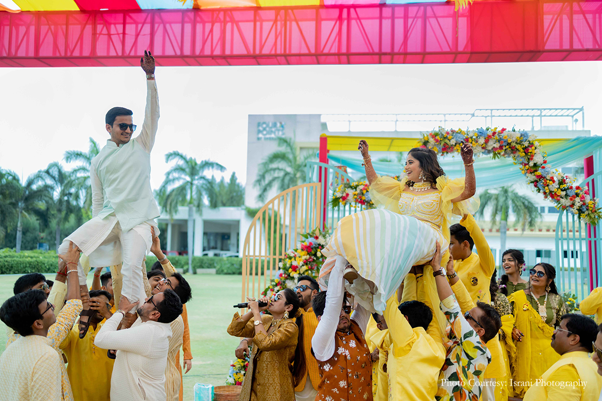 Akansh B Jain from Weddingz By Mindz shares, “The first and as usual the most fun event was the haldi. The show started with a flash mob entry along with the colour crackers in the background. It was followed by engaging activities with the emcee. After this, a Dj based band took over the crowd while a floral-based haldi took place for the to-be-weds.