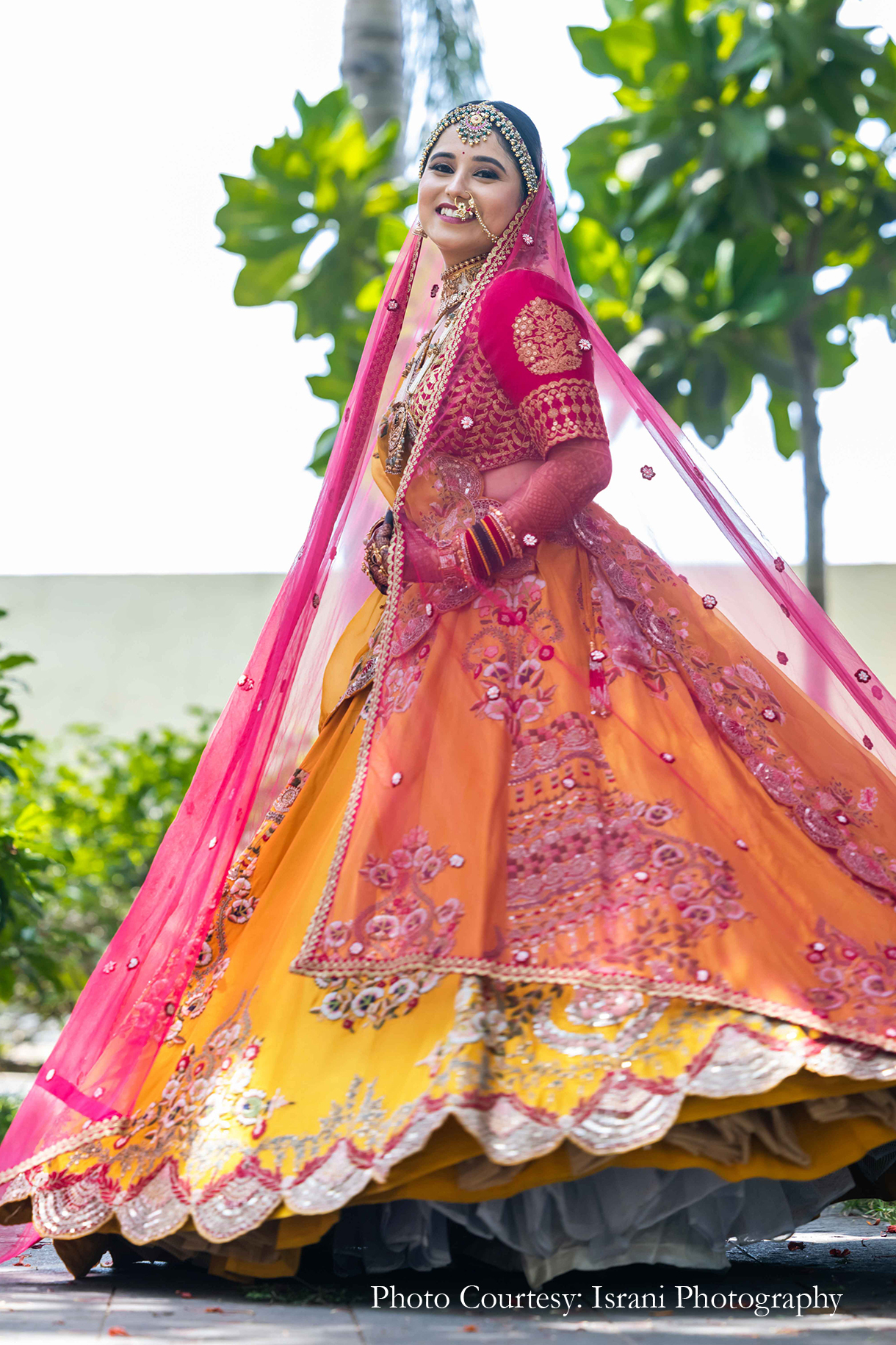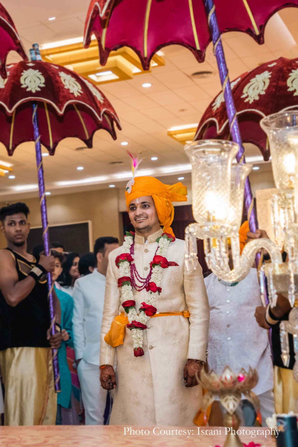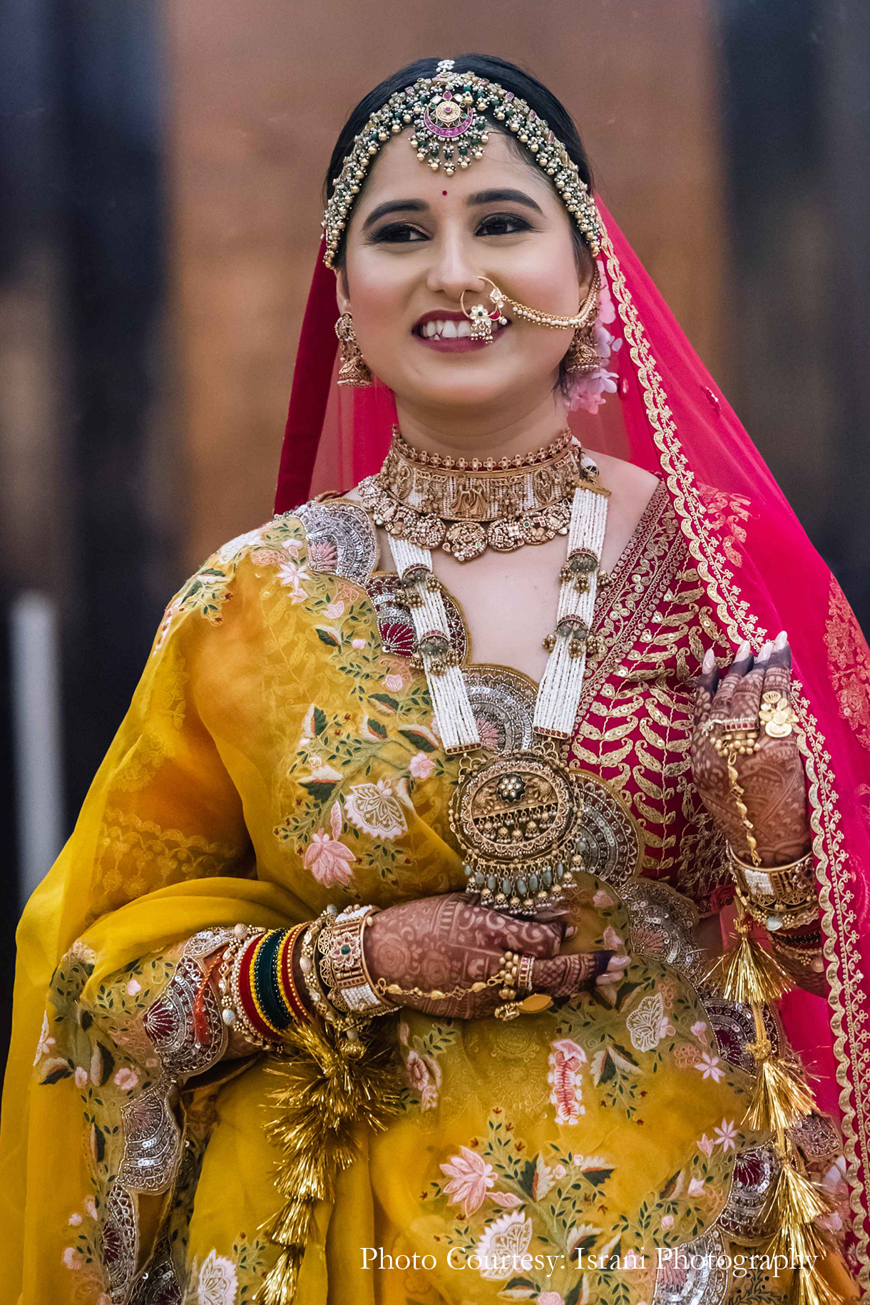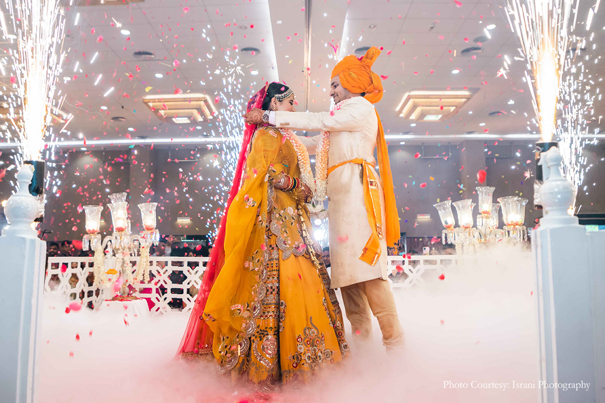 Akansh shares, “The next day, the Jain wedding celebrations began with a high-energy baraat that consisted of a mobile DJ and dholis. The jaimala took place in the hall while the couple was flanked by dancers as they made their entry. Themed around ‘sheesh mahal’, the wedding sported regal decor and the phere took place at midnight under a floral mandap.”