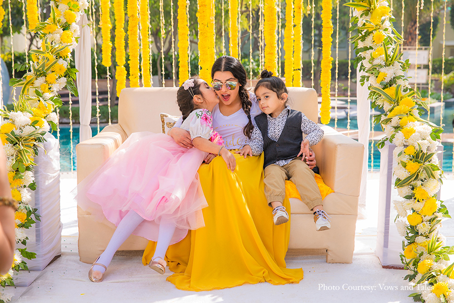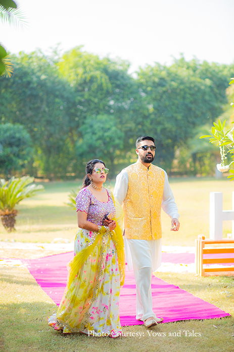 The festivities kicked off with a traditional Maiyan event for the bride, and a Vidhi ceremony for the groom, hosted at the expansive lawns of Le Meridien. With bright citrus hued decor, the function was a heady mix of sunshine and merriment as the couple was smeared with turmeric paste. The bride looked chic in a white ‘Bride’ T-shirt, mustard flowing skirt and sunglasses, while the groom sported a mustard and white Bandi jacket and kurta set.