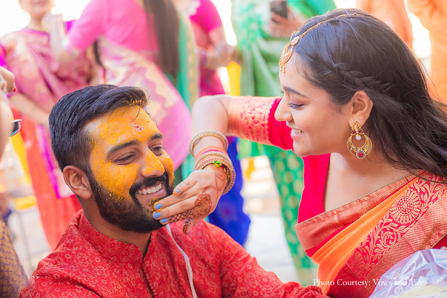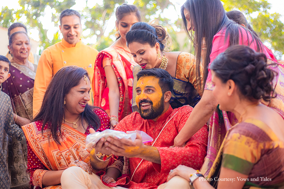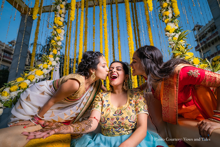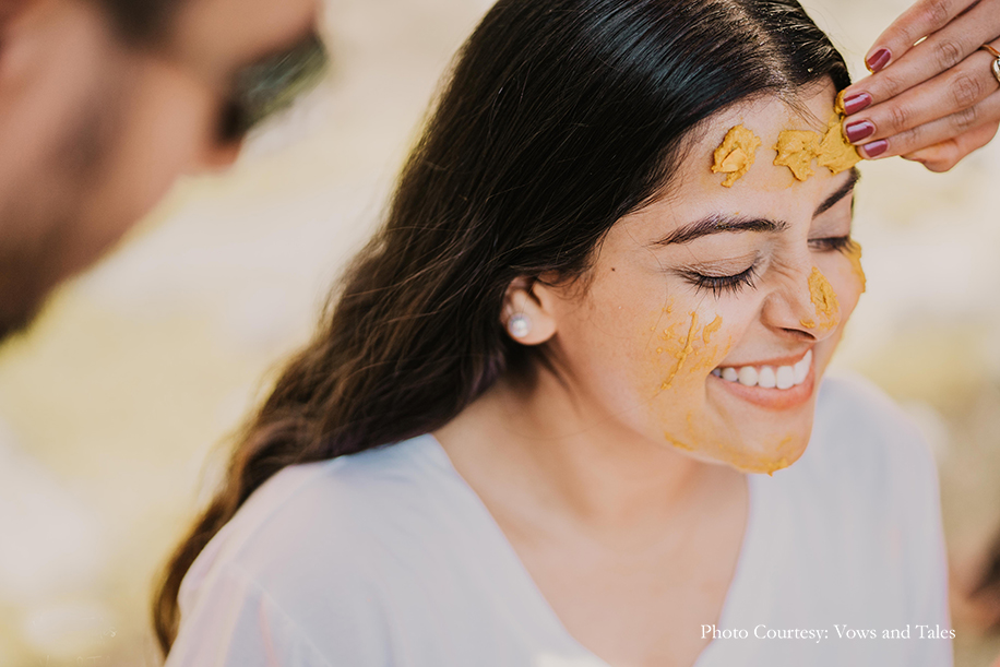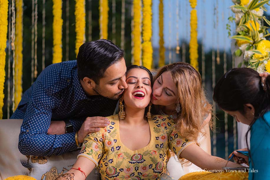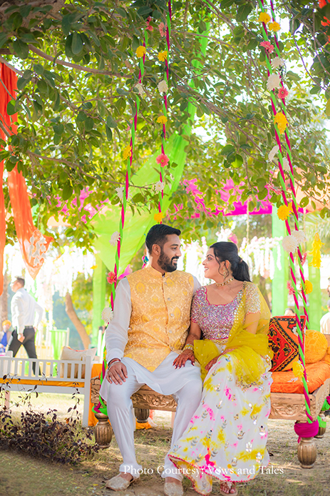 The colorful welcome brunch hosted at the Heritage Resort saw decor elements such as vibrant drapes, quirky props and open verdant surroundings which lent a laidback and cheery vibe to the event. Everyone got a chance to mingle and relax. The groom’s lemon and ivory attire complemented the bride’s blush and lemon lehenga perfectly at this event.