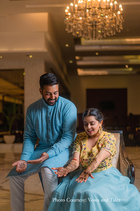 The mehndi function was also held at Le Meridien and followed a yellow and white decor palette. For this, the bride wore a lemon top embroidered with vibrant motifs with a flowing high-low sky blue skirt which she paired with a statement pearl and meenakari earrings. The groom matched her perfectly in his sky blue kurta.