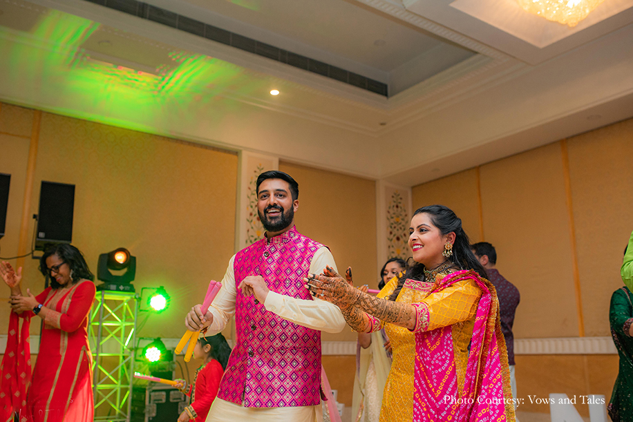 The sangeet night saw energetic dance performances by the couple and their loved ones, rocking music, and a whole lot of fun. The bride opted for a vibrant fuchsia and mustard silk sharara set with bandhani work which she teamed with Polki jewellery, a glowing visage and soft wavy hair. The groom teamed his beige silk kurta-pajama with a pink Bandi jacket.