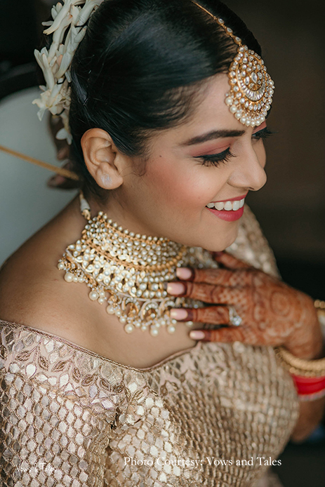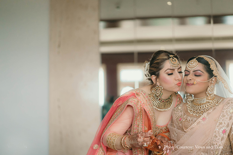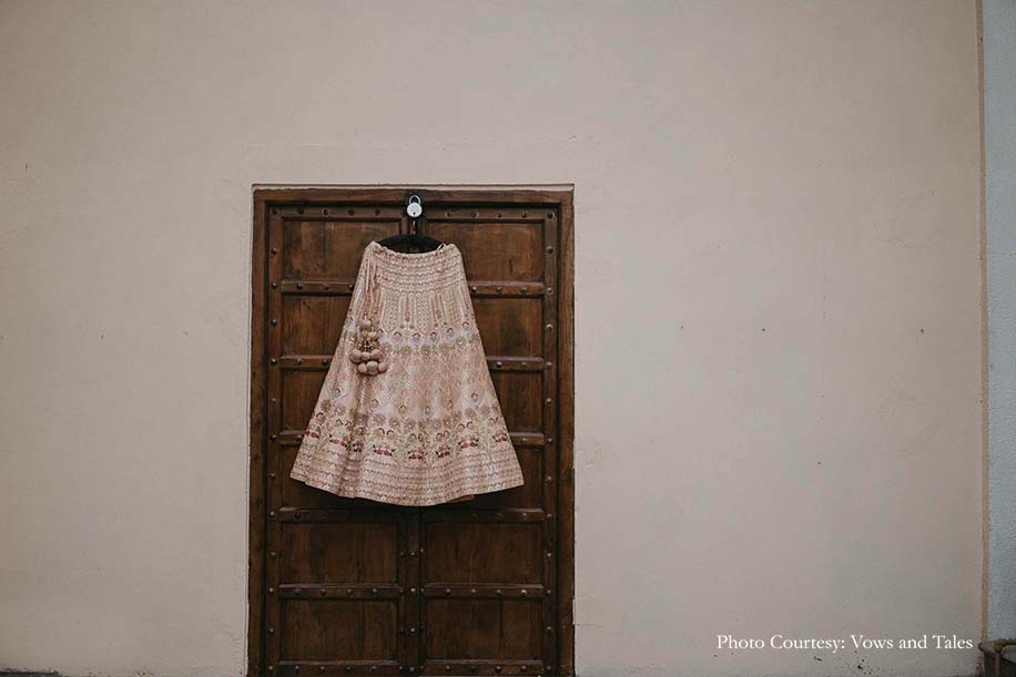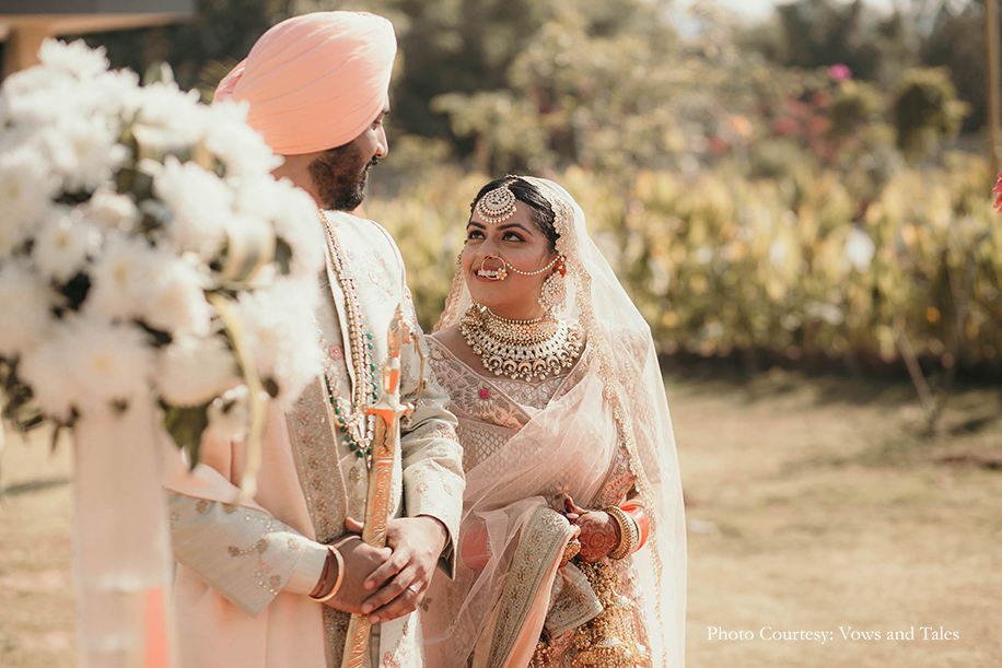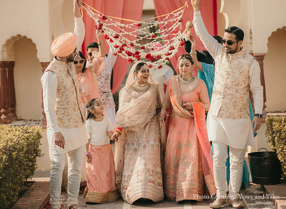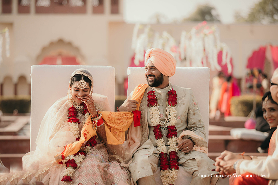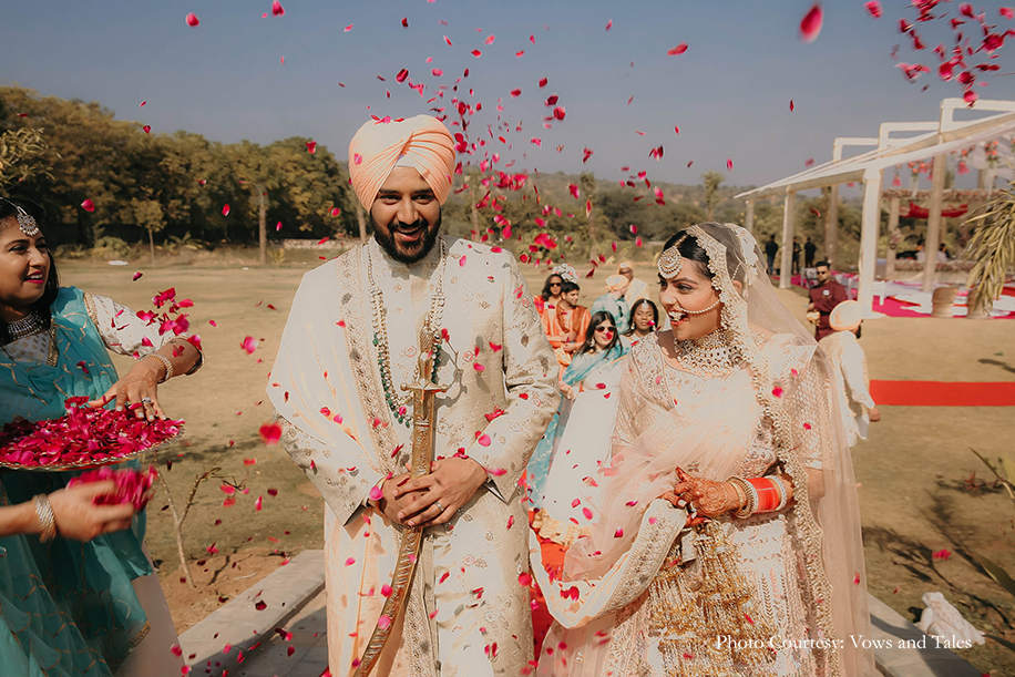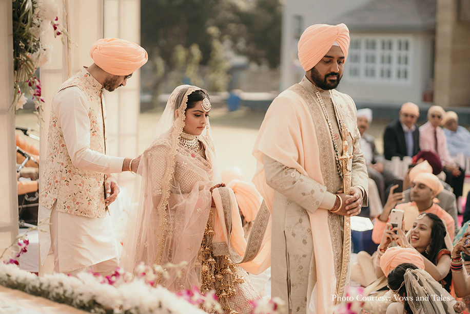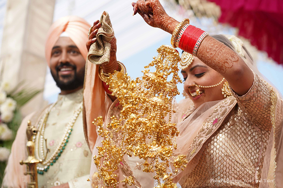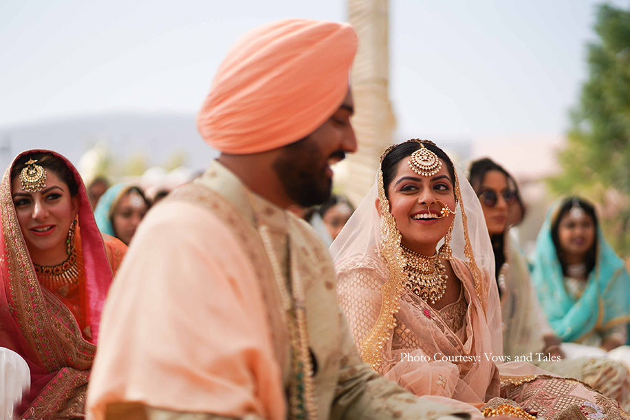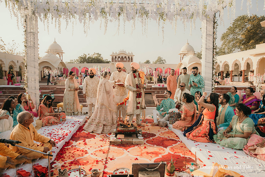 Dressed in perfectly coordinated peach and cream ensembles, the couple tied the knot in two ceremonies. The Sikh nuptials were held in a nearby farmhouse, followed by the Gujarati ceremony which was hosted by the water, under a white mandap alongside the majestic dome architecture of Heritage Resort.