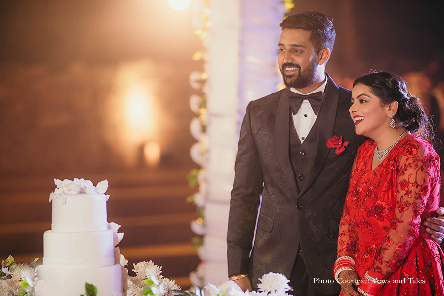 The festivities concluded with a stylish reception hosted outdoors at the Heritage Retreat. Elegant floral arrangements, a pristine white cake and the fabulous stage set a classy ambiance bathed in the warm glow of the lights. The bride looked ravishing in a fiery red gown with sleek pulled back hair, while the groom exuded charisma in a black tuxedo.