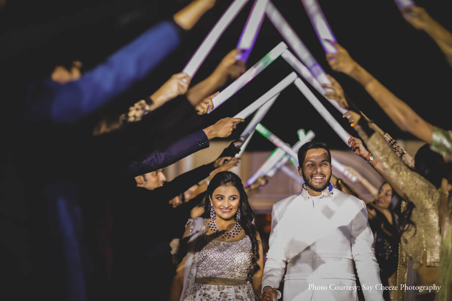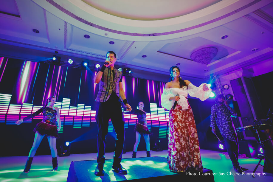 Fairy lights illuminated the entrance and made for a picturesque spot at the venue. LED lights and sparse floral arrangements formed the basis of the décor within the ballroom at Taj Lands End. The Mirror Bar featured quality service by Flaming Trio bartenders and became a hub that evening as an energetic performance by the Vyas Brothers kept the guests on their feet.