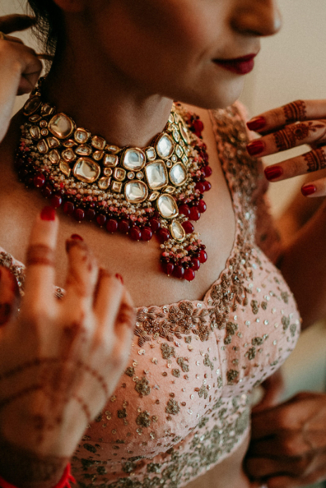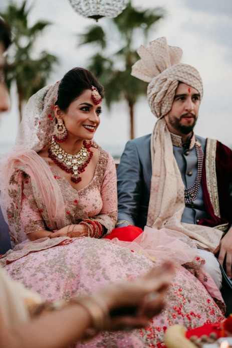 Divya opted for a pastel lehenga with gold embroidery alongside orange and red floral accents which she paired with an ornate kundan set. Her glowing smile matched her glimmering jewellery as she made her way towards her groom.