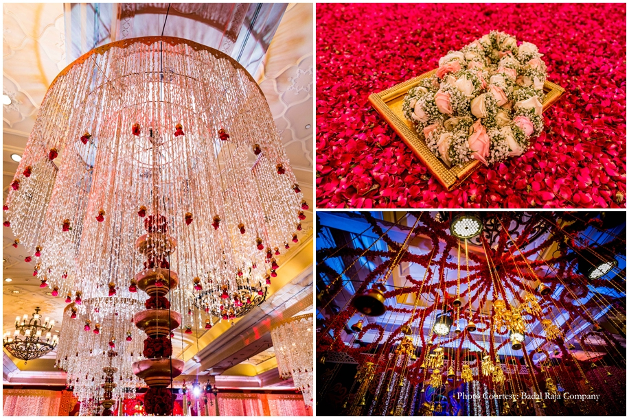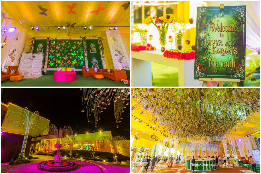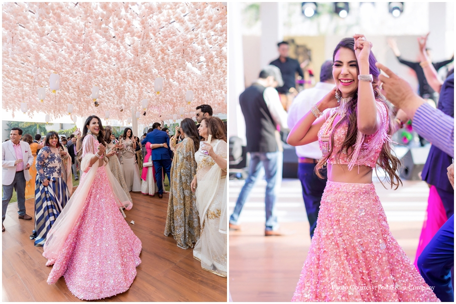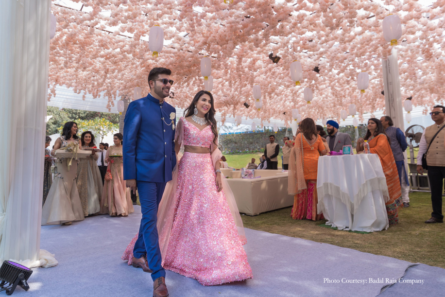 The outdoor engagement ceremony had a Japanese cherry blossom theme, and it was one of the highlights of Divya and Karan’s wedding celebrations. Pastel hues alongside pretty pink cherry blossoms and glowing Japanese lanterns that covered the ceiling of the space on the lawn looked dreamy in the daytime. Divya looked resplendent in a shimmery pink lehenga by Suneet Varma and Rahul complemented her in a royal blue suit by Raghuvendra Rathore.