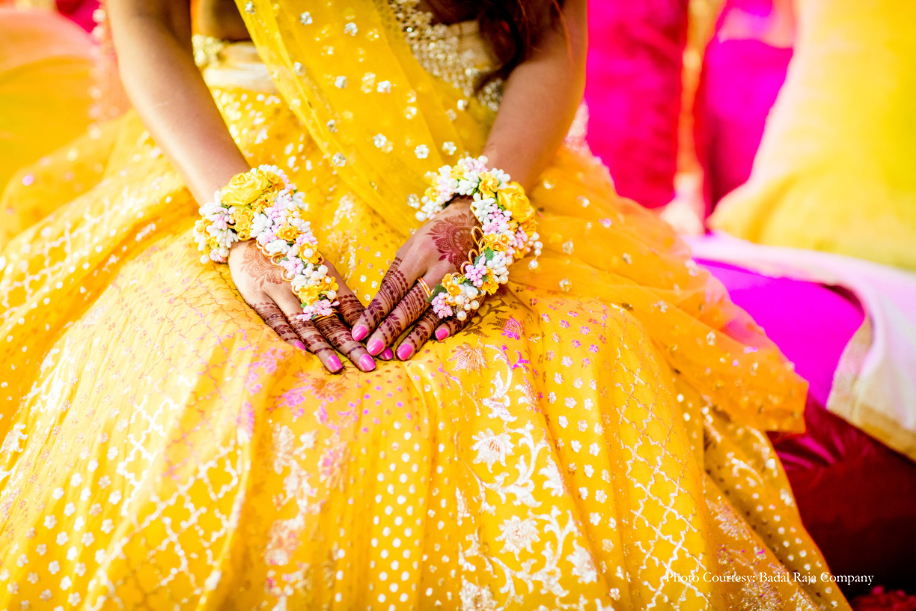 Divya’s colorful haldi was hosted indoors and the décor, customized to the bride’s personal style with a bright pink floral arrangement that led to a traditional palette of orange and yellow florals. The bride looked radiant in a yellow ensemble paired with floral jewellery. Traditional rituals and a splash of colors set the mood for the occasion.