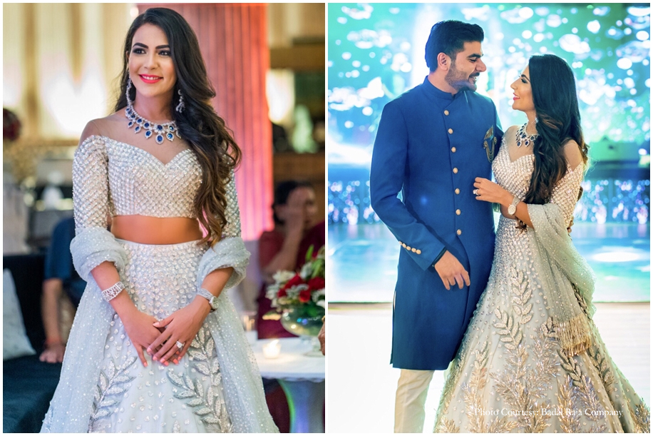 The sangeet was the liveliest function of all, and it helped set the right tone by getting everyone into the celebratory mood instantly. The key decor colors for the night were red, blue and gold. The stage with its well-lit backdrop and a ceiling full of chandeliers was the highlight of the setup. For this function, Divya wore a beautiful Manish Malhotra creation and paired it with a blue sapphire diamond set. Karan looked regal in his blue bandh gala outfit.