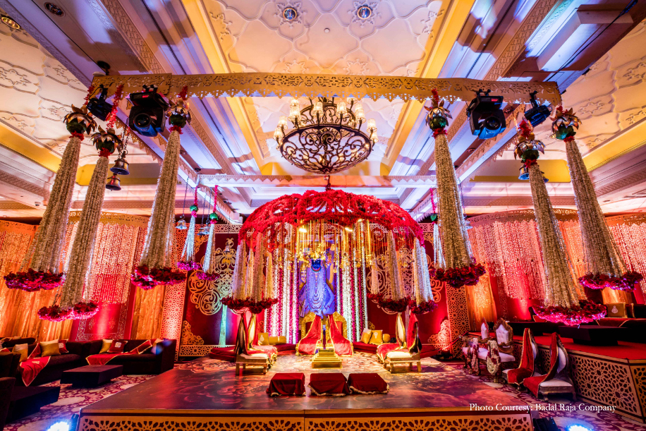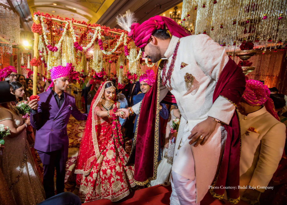 Divya and Karan’s pheras took place in the magnificent ballroom of the Taj Palace Hotel. The breathtaking setting included decor in red, white and gold. A picture-perfect mandap was created with vibrant floral arrangements, and it was one of the highlights of the function. Divya wore a red Sabyasachi lehenga, and Karan chose to don an off-white Shantanu and Nikhil ensemble.