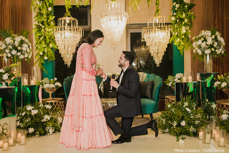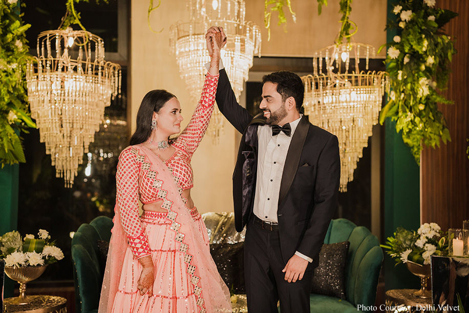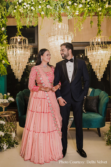 “The evening celebrations for the Sangeet and engagement were infused with a glamorous green theme, setting the stage for a night of non-stop dancing and boundless fun. The goal was to keep the atmosphere lively and joyous, encouraging both families to laugh, revel, and move to the infectious rhythm of celebration. Given my Bihari heritage, my family delighted in dancing to our favourite Bihari songs, creating an atmosphere of unlimited joy and merriment. The experience was truly surreal, bringing together loved ones in a night filled with unforgettable moments and cherished memories”, recollects Divya.