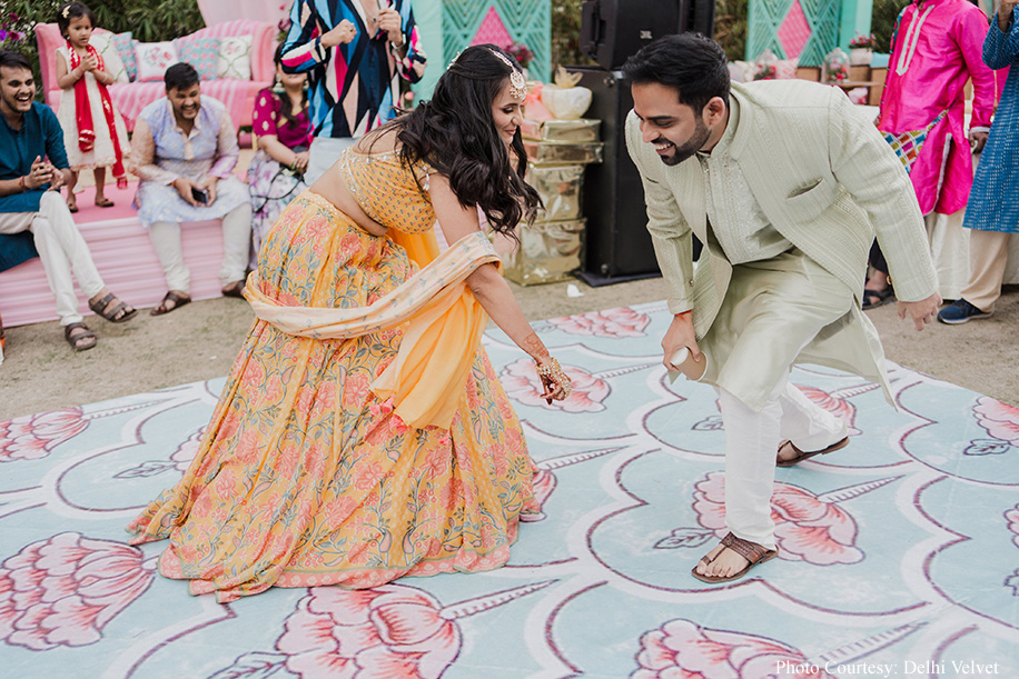 Divya shares, “The mehendi celebration embraced a whimsical floral theme, evoking the charm of a natural garden setting. As the first event of our wedding festivities, it served as a warm welcome for our guests and an opportunity for both families to meet and greet. Instead of traditional gifts, we curated unique counters for our wedding guests. Stainless steel straws and head massagers were offered as thoughtful return gifts, elegantly displayed on charming carts. For the ladies in our family, we arranged live bangle counters, adding a touch of grace and beauty to the occasion. To infuse the mehendi with a spirit of joy and playfulness, we also set up a ‘shoot the balloon’ counter where the guests were kept engaged.”
