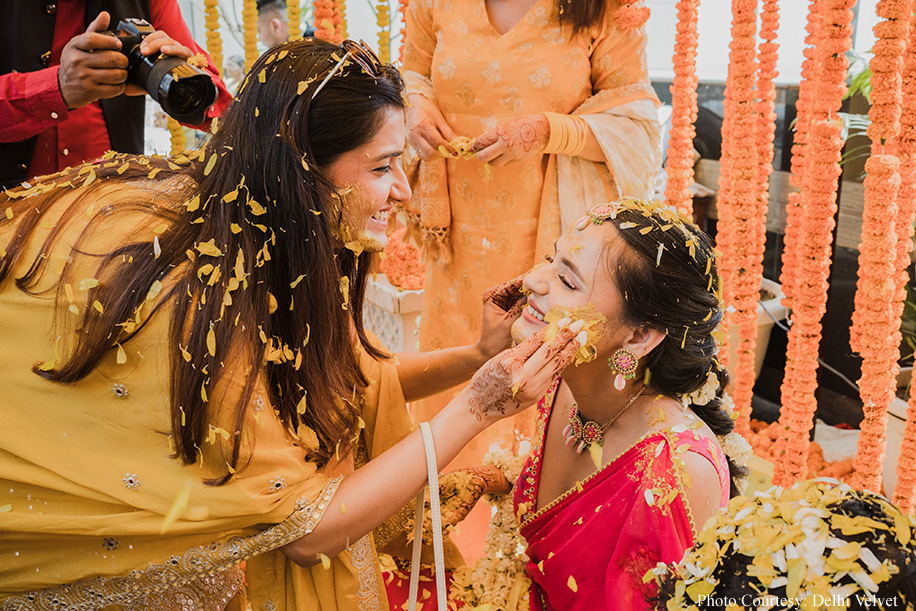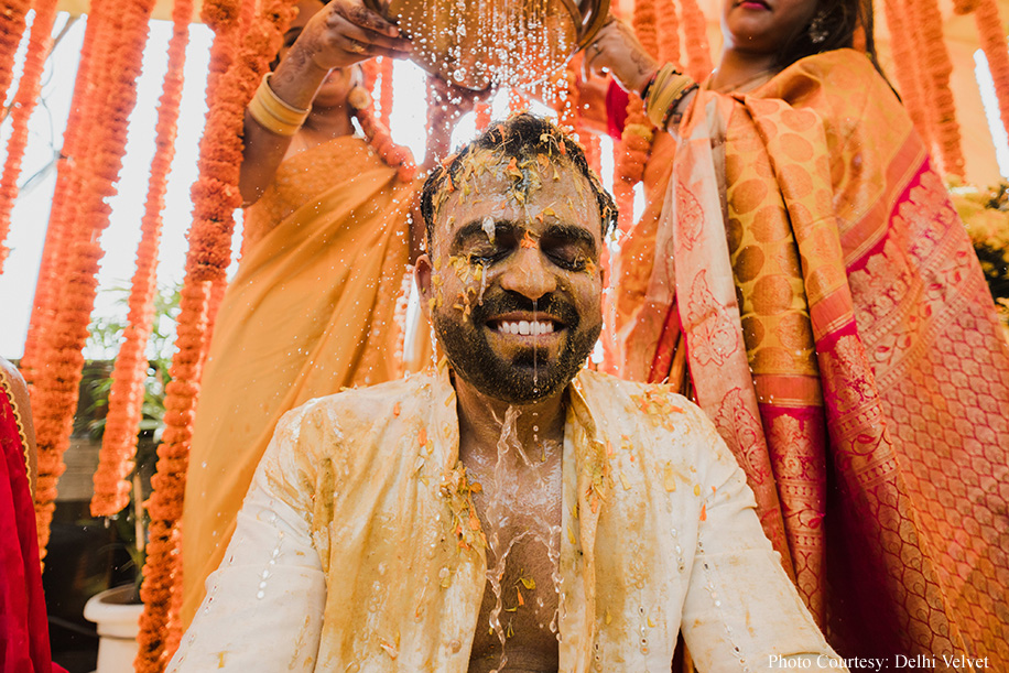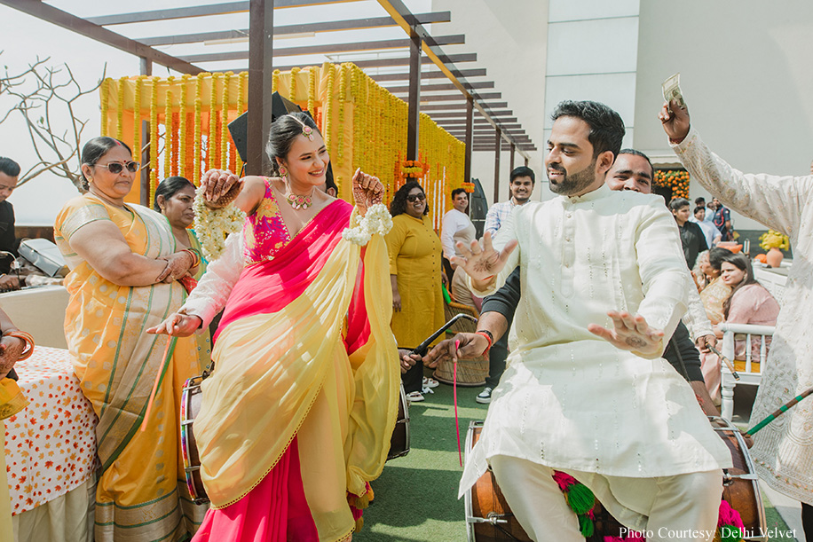 The following morning, the couple celebrated the haldi ceremony with a vibrant orange bliss theme by the poolside on the terrace. Recollecting the fun moments of the event, Divya says, “We danced enthusiastically, immersing ourselves in haldi and flowers, sharing plenty of warm embraces, tears, and kisses. A nostalgic 90s-themed candy counter featuring a delightful assortment of candies delighted our guests and sparked a wave of nostalgia.”