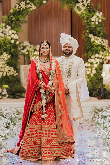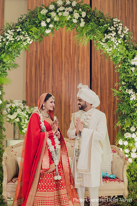 Divya shares, “The color scheme for the wedding was a serene combination of ivory and green, exuding simplicity and elegance. To create a surreal ambience at the event, we requested our guests to wear outfits in either ivory or red. Floral decor was prominently used with a large arch adorned by foliage punctuating our varmala moment and suspended blooms over the wedding mandap.”