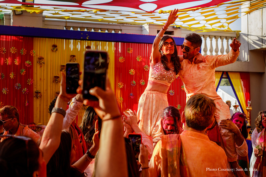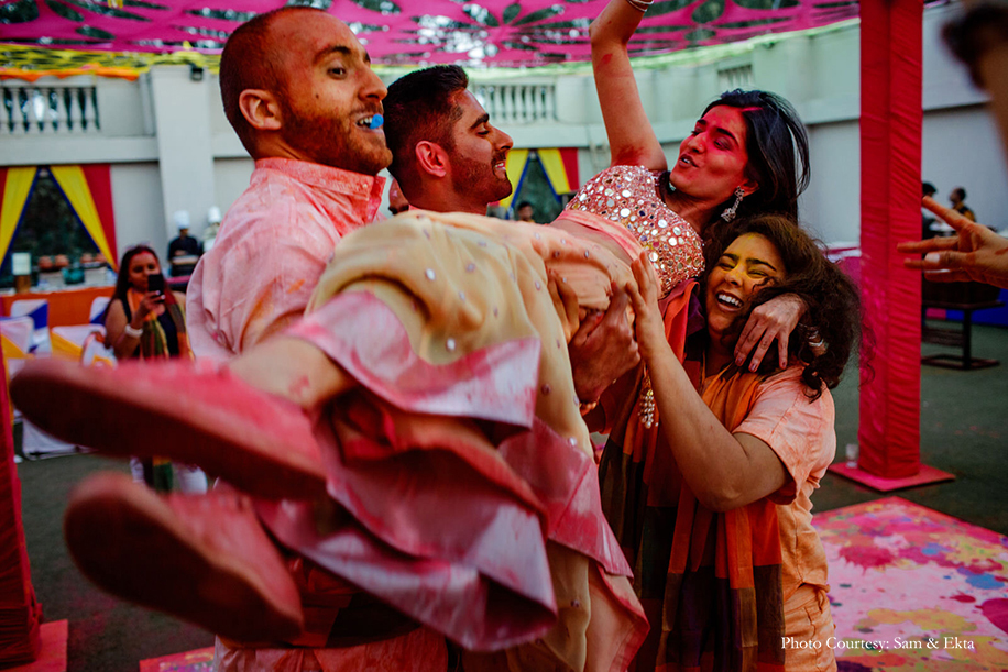 “Sid and I have both lived away from our families for over ten years and had not celebrated Holi with them for a long time. So we decided to kick start the celebrations with a colorful Holi party. The idea was to get our loved ones from across the world under one roof so that they could get to know each other. Everyone wore white outfits and we gave them colorful scarfs to go with the theme. Sid and I wore lemon yellow outfits with mirror embellishments. The party was all about enjoying bhaang, playing games, and getting drenched in colors.”