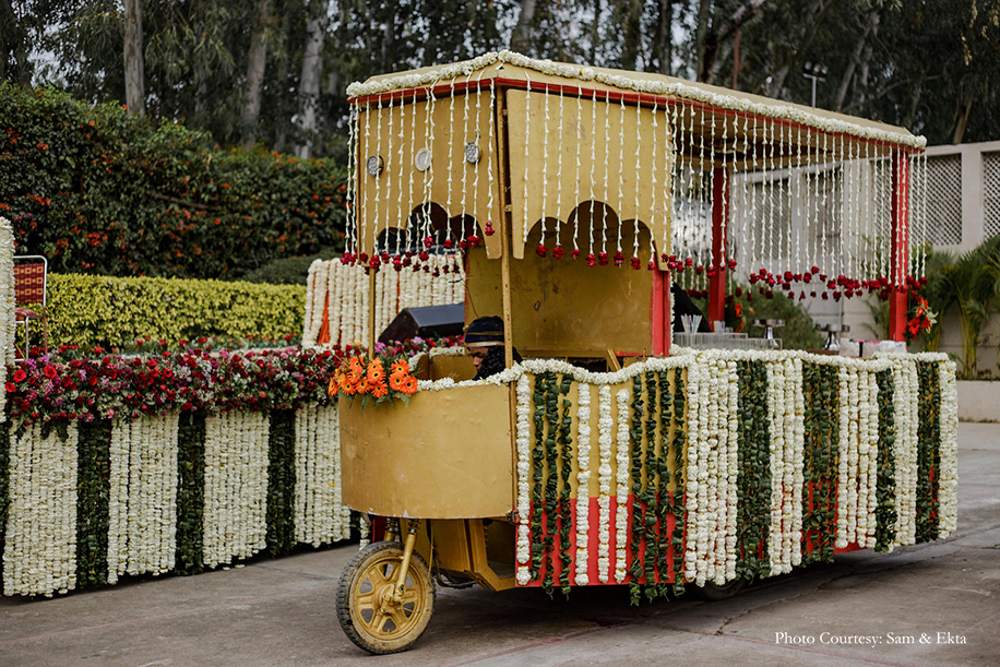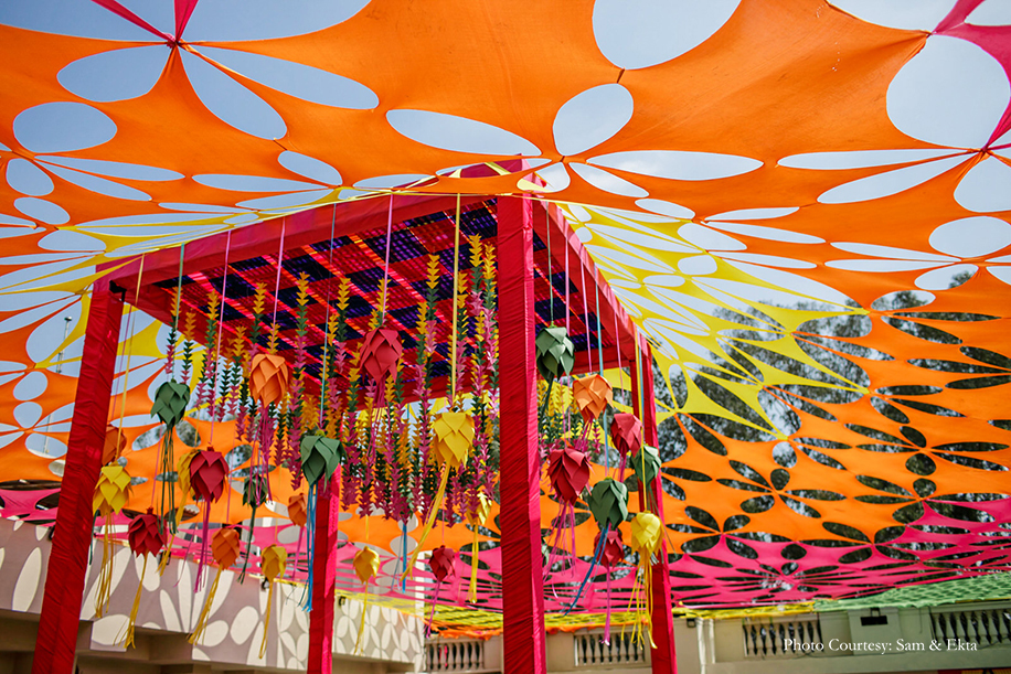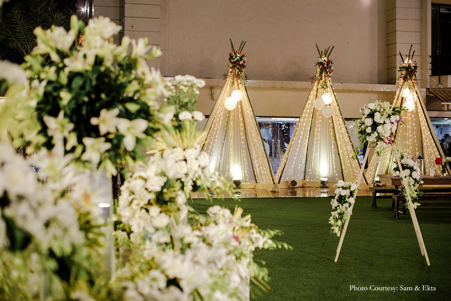“Our mehendi ceremony was an intimate function dedicated to our family and close friends. The function started with the elder ladies of our families playing the traditional drum and singing old folk songs, which was followed by speeches and dances performed by everyone present. The theme was ‘Bohemian-Moroccan,’ and included low seating sofas, lamps and tents. However, the function was to be hosted outdoors and it suddenly started pouring heavily. So we moved everything inside, and the very helpful staff of the hotel helped us put something together in one hour. We had to host all the dances and speeches indoors. But now that we look back, we feel really thankful for the rains. Due to the smaller indoor space, everyone stood around in a circle to watch the performances which symbolized warmth and love for us.”