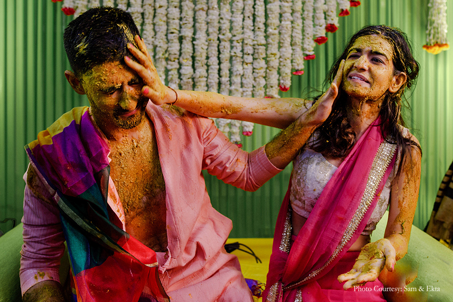 “Our wedding ceremony was preceded by the haldi ritual. Our closest friends and family members smeared turmeric paste on us as well as on each other. This was followed by the ritual of tearing the groom’s kurta.”