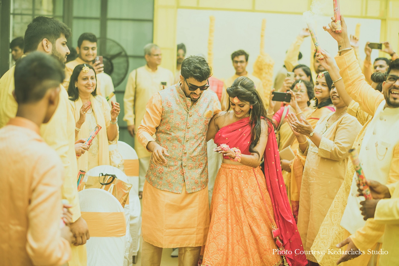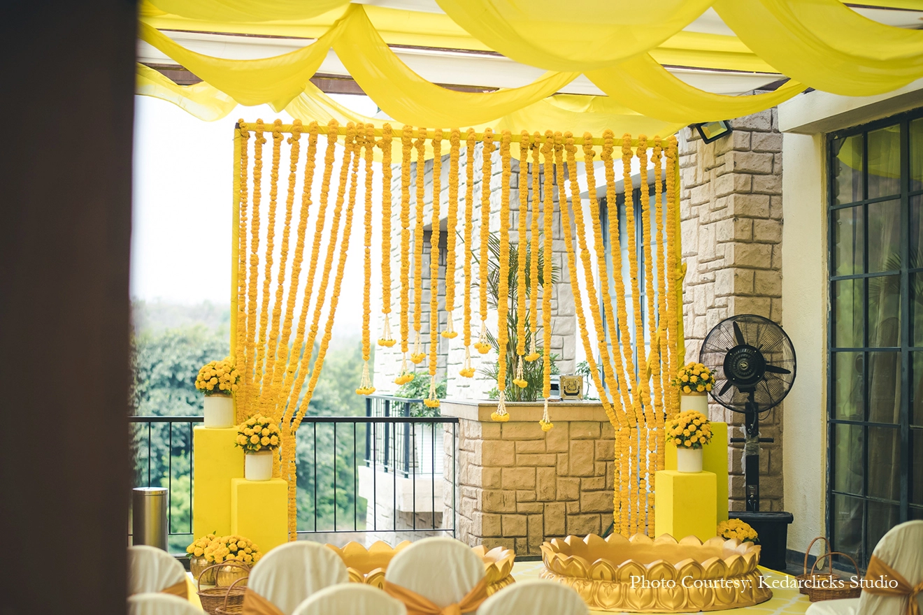 Hosted on the terrace, the Haldi was a sunkissed soiree with a refreshing decor of yellow flowers and drapes. Inspired by the quirky energy of the song “Sooraj ki Bahon Mein”, the couple arrived dancing to its beats with smoke bombs and dhol music. The bride and groom both dressed in citrus hues for the lively occasion.