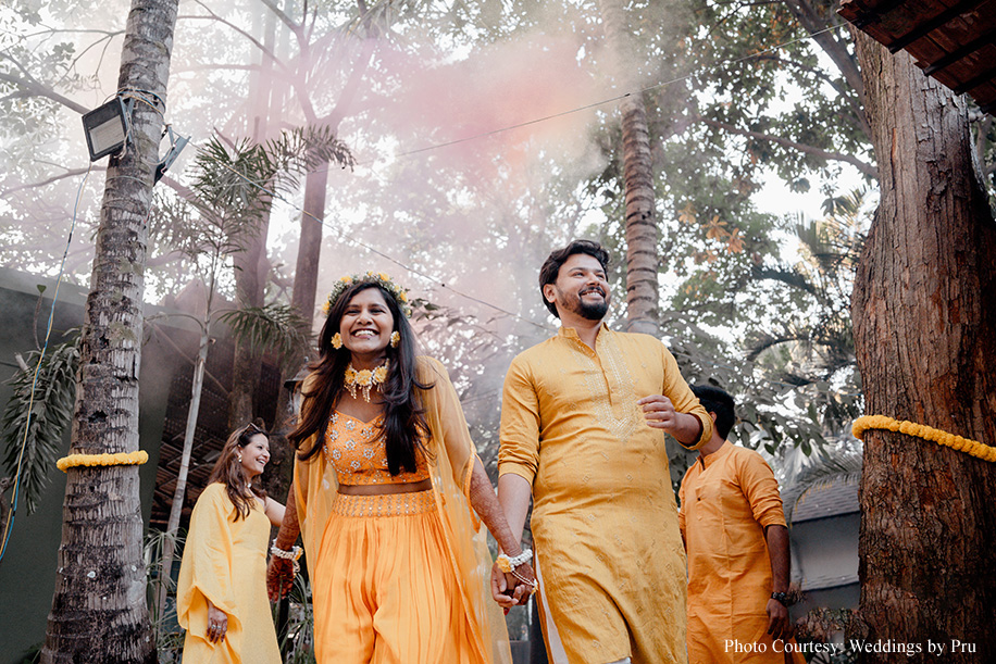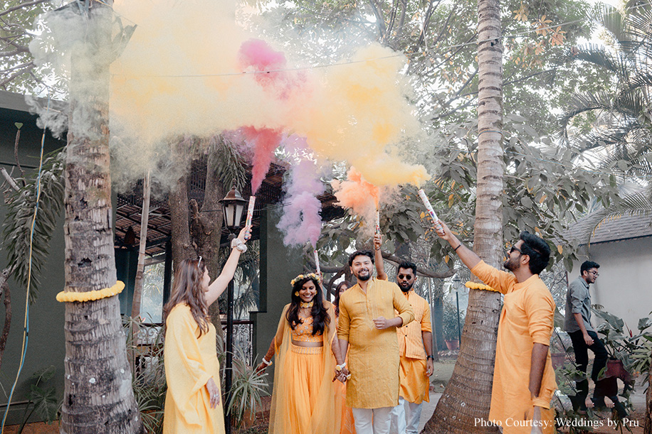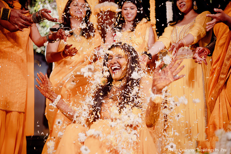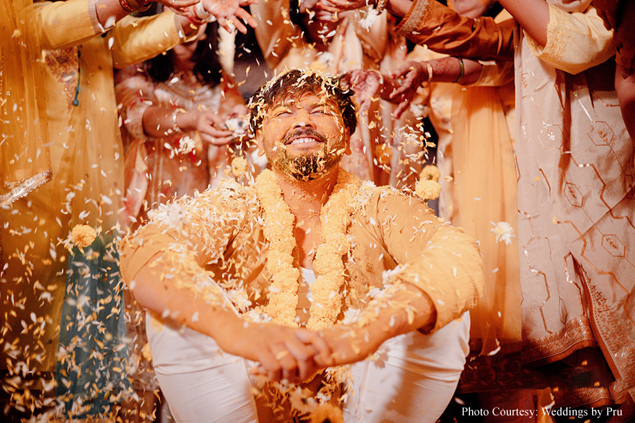Hues of white and yellow lit up the earthy backdrop of the venue for the Haldi function. Dressed in matching tones of mustard, the bride and groom danced into the festivities amidst colorful smoke, where they were anointed with turmeric and showered with flower petals by their loved ones.