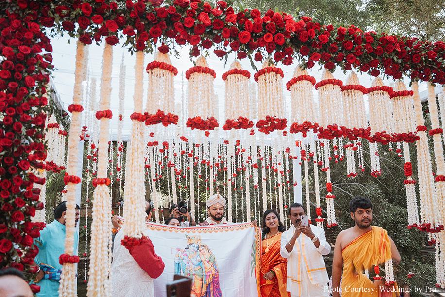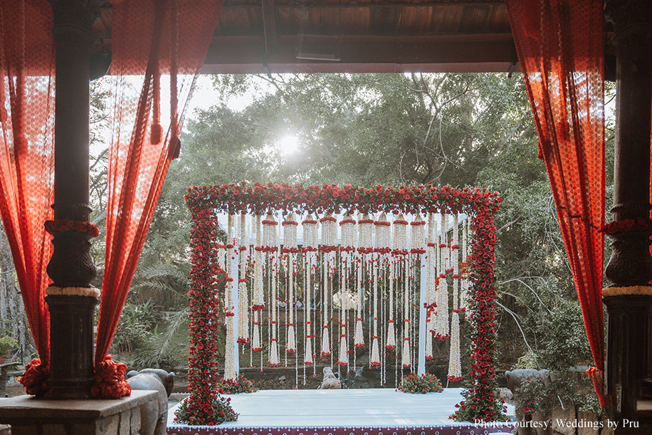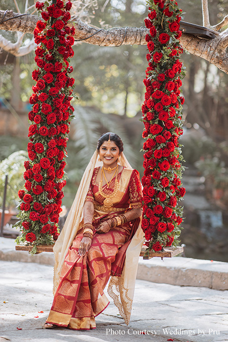 Hosted on Valentine’s Day – the day of love, the Wedding was resplendent in hues of red and white. From the stunning floral swing covered in red roses to the phoolon ka chadar and the magnificent mandap with its canopy of flowers, the vibrant color palette was everything with a sense of tradition and tranquility. The couple was the picture of love as they took their vows.