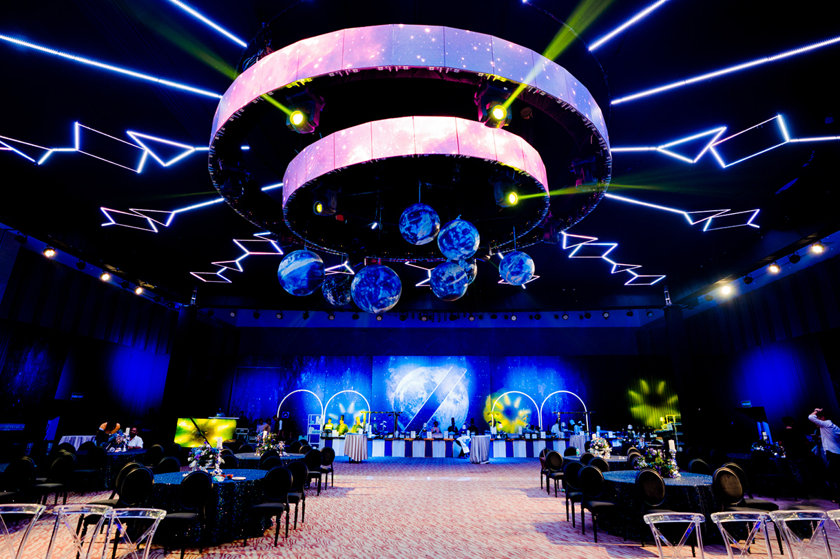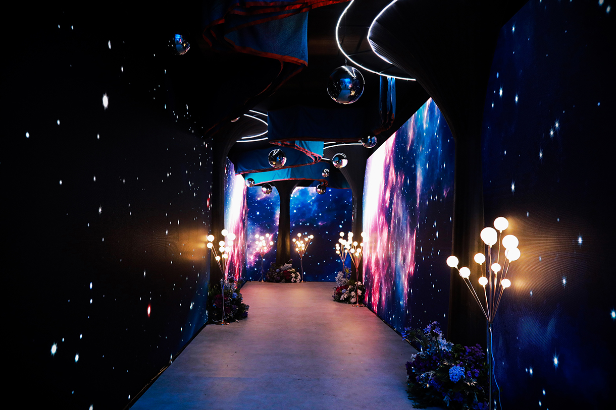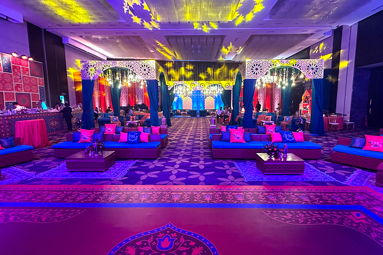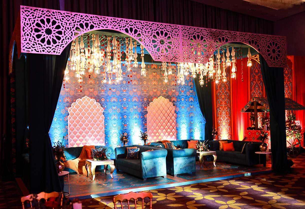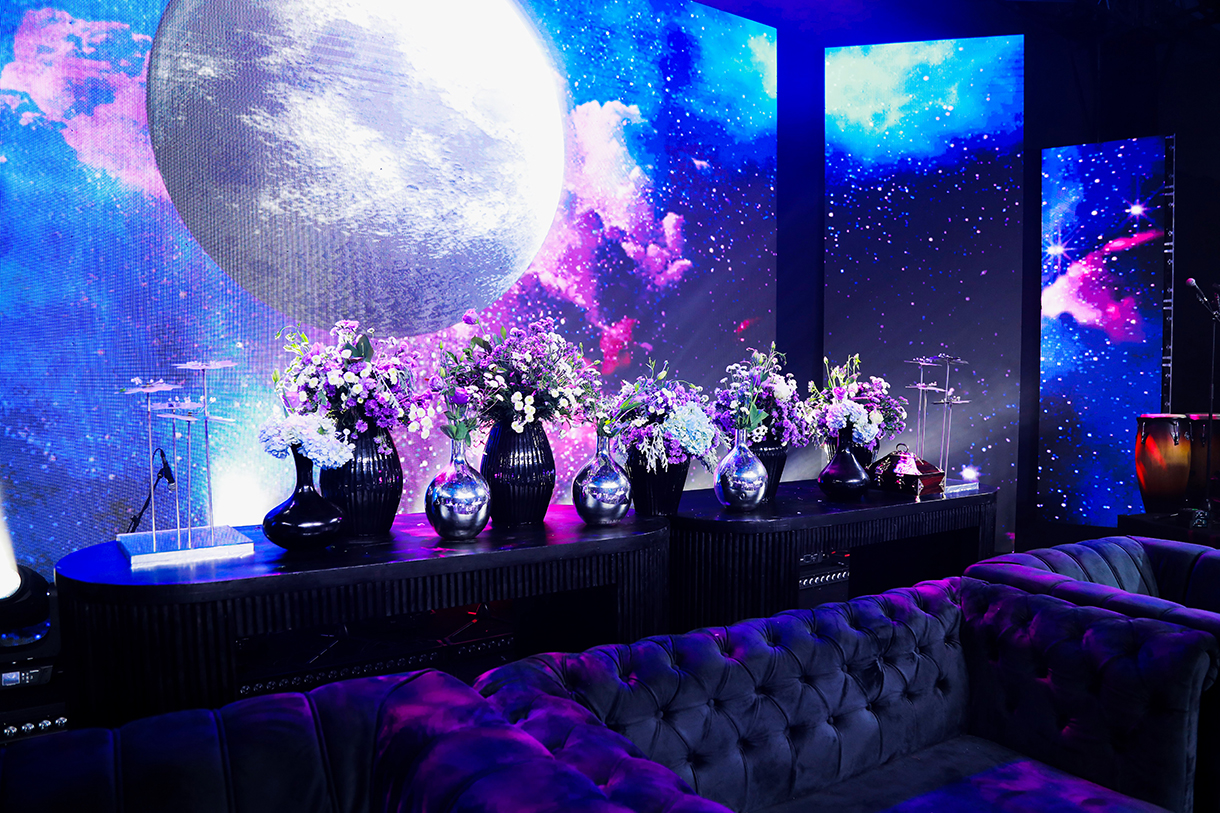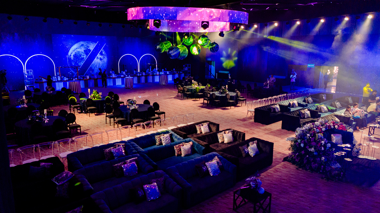 Under a canopy of shimmering constellations and orbs, the couple’s ‘Celestial’ Sangeet was a visual and emotional spectacle. Ethereal lighting, plush velvet seating, and sequinned accents created a dreamscape worthy of the stars. Guests danced under galaxies of light, while cosmic-themed decor sparked magic in every corner.