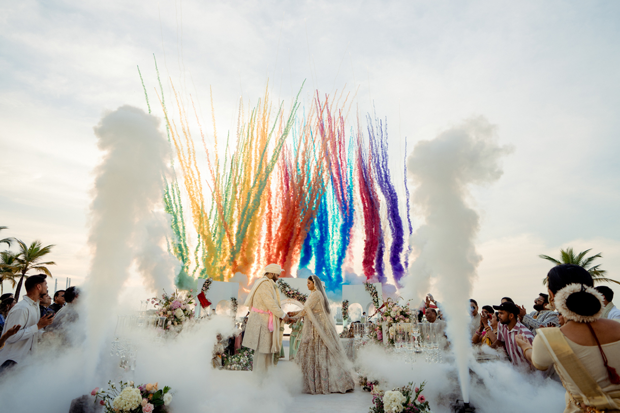 With Drishti’s background in wedding design, it was no surprise that the couple set their sights on an experience that was both opulent and sensorially rich. Together with Watermark Weddings, they envisioned a wedding design and decor that was visually arresting and emotionally resonant. Sidhesh Kandiyil from Watermark Weddings shares, “Each event was thoughtfully themed. From a culturally rooted Kerala welcome to an Italian carnival, a mystic Sufi soiree, a star-studded Sangeet, and finally, an ethereal pastel garden wedding that closed the celebrations on a tender, romantic note.”