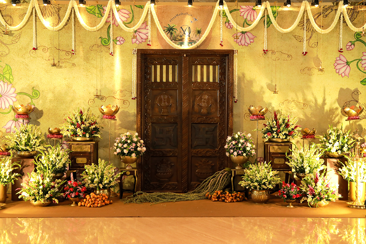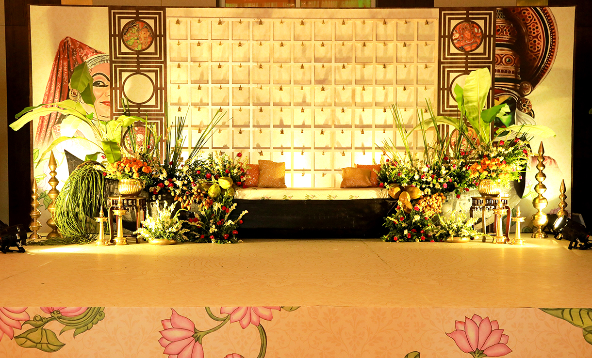 Mohit and Drishti’s wedding festivities opened with a soulful nod to southern tradition. The powerful beats of Chenda Melam filled the air as guests were greeted with a warm Kerala welcome, while a graceful Kathakali performance painted the atmosphere with regional artistry. The evening culminated in an authentic Sadhya feast, an indulgent spread of Kerala delicacies served on banana leaves.