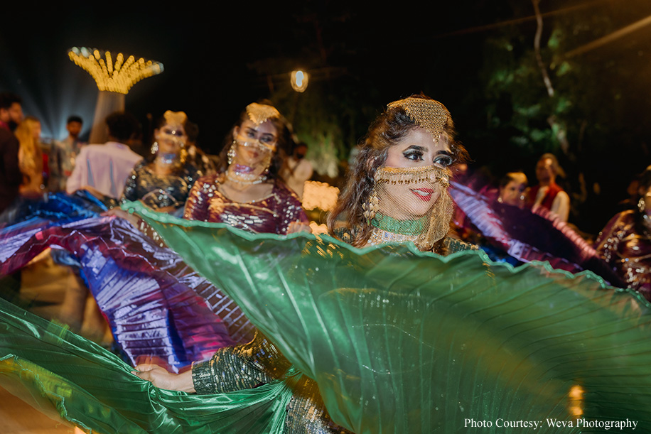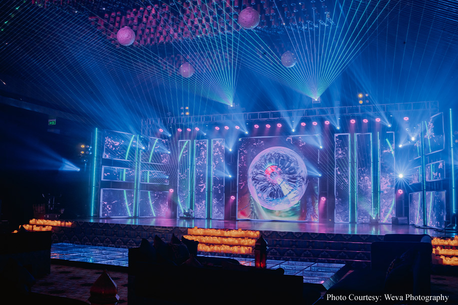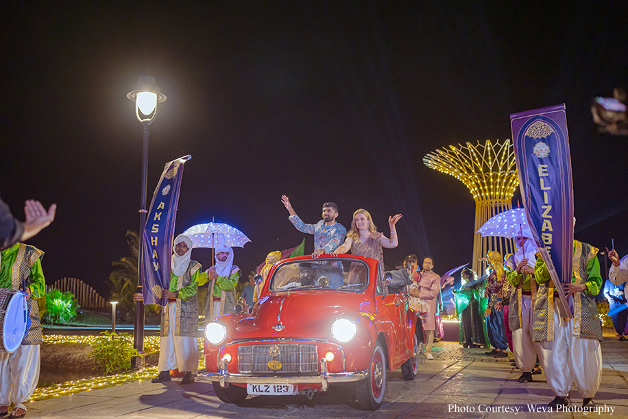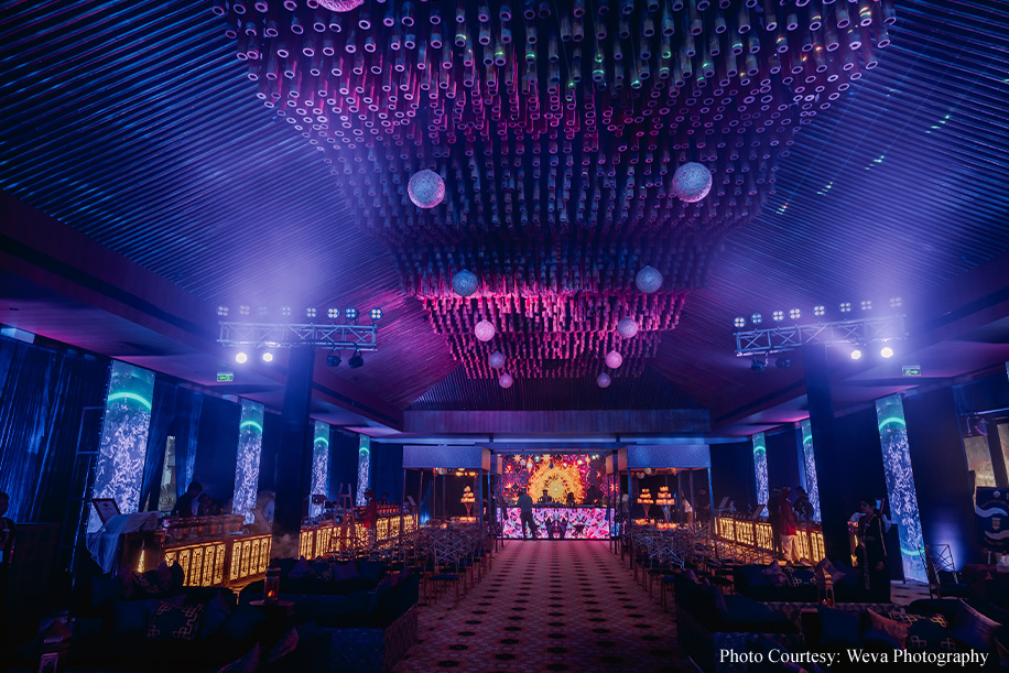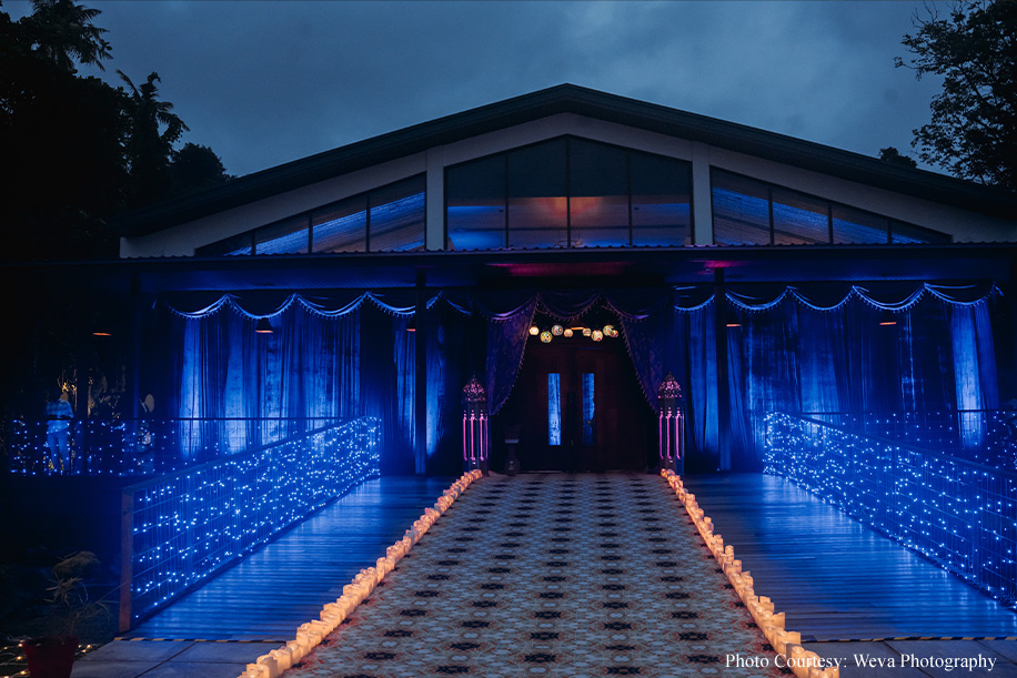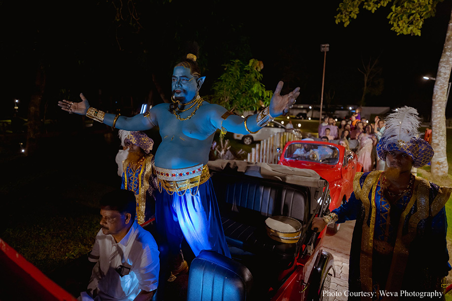 Hosted at KTDC Waterscapes Kumarakom, The Sangeet was an incredible, ‘Arabian Nights’-themed event. The décor was bathed in hues of blue, purple, and gold. The evening saw a baraat procession with a Genie, while Arabian-themed guards and dancers, friends, and families of the couple brought the couple to the venue, who drove in in a vintage car. Heeramandi-inspired artists entertained the guests with their traditional dance, while a cinematic dance team kept the spirits high with all the latest Bollywood dance numbers. A tarot and a coffee cup reader also engaged the guests through the night.