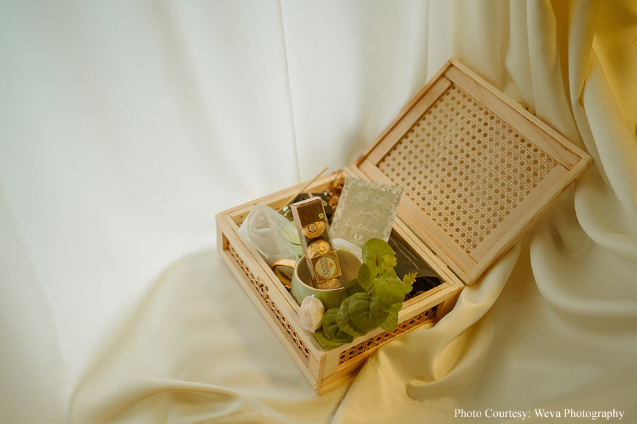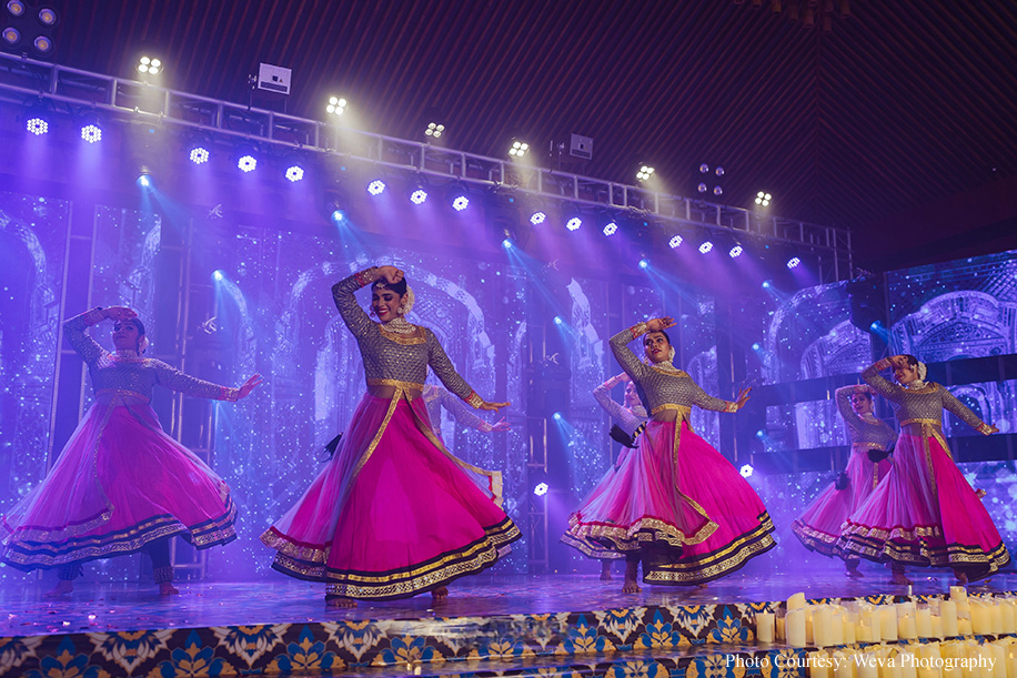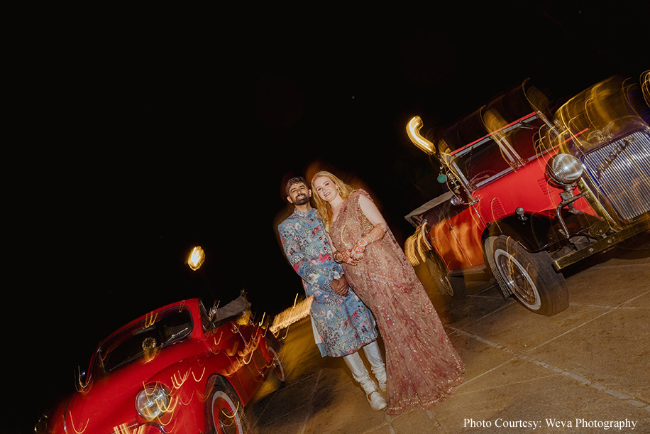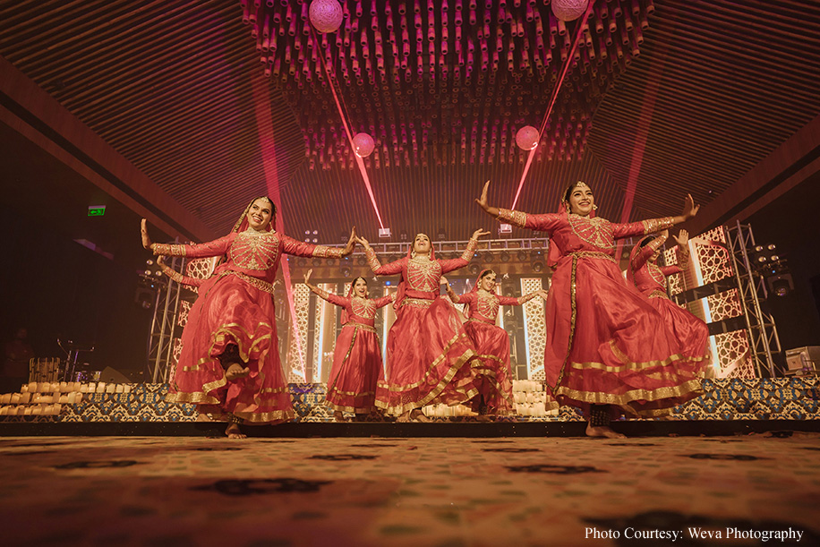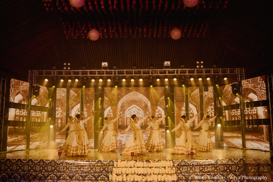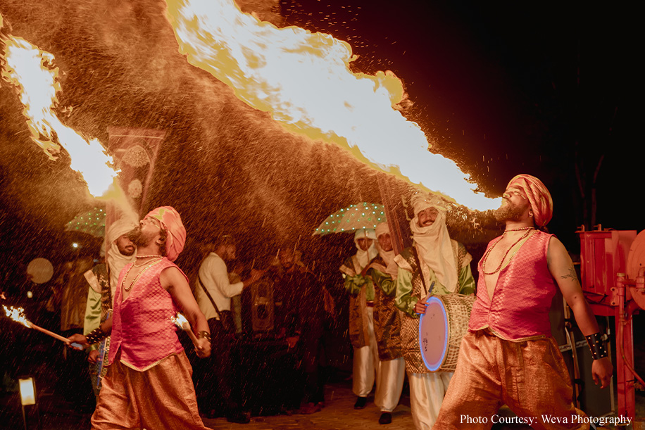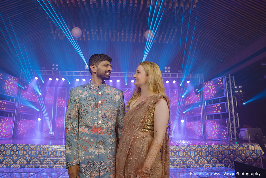 Hosted at KTDC Waterscapes Kumarakom, The Sangeet was an incredible, ‘Arabian Nights’-themed event. The décor was bathed in hues of blue, purple, and gold. The evening saw a baraat procession with a Genie, while Arabian-themed guards and dancers, friends, and families of the couple brought the couple to the venue, who drove in in a vintage car. Heeramandi-inspired artists entertained the guests with their traditional dance, while a cinematic dance team kept the spirits high with all the latest Bollywood dance numbers. A tarot and a coffee cup reader also engaged the guests through the night.