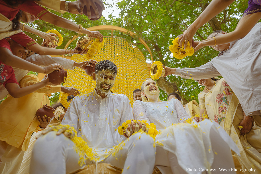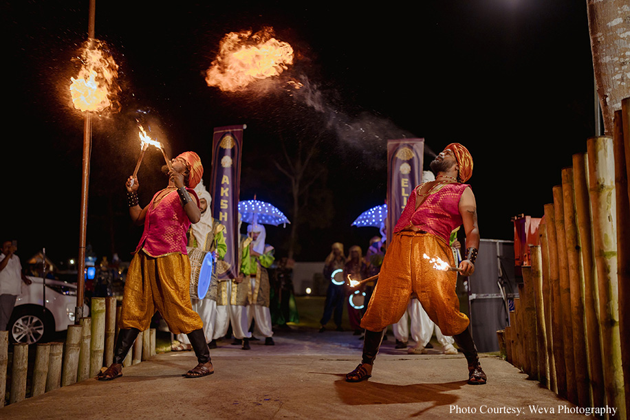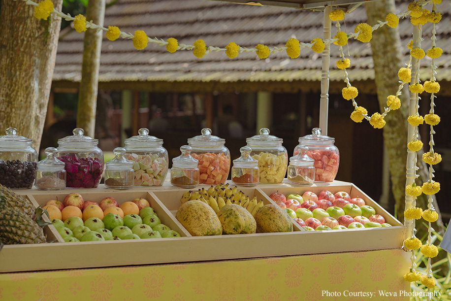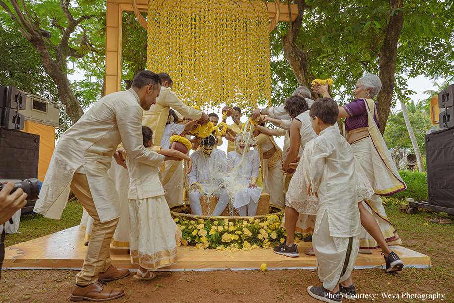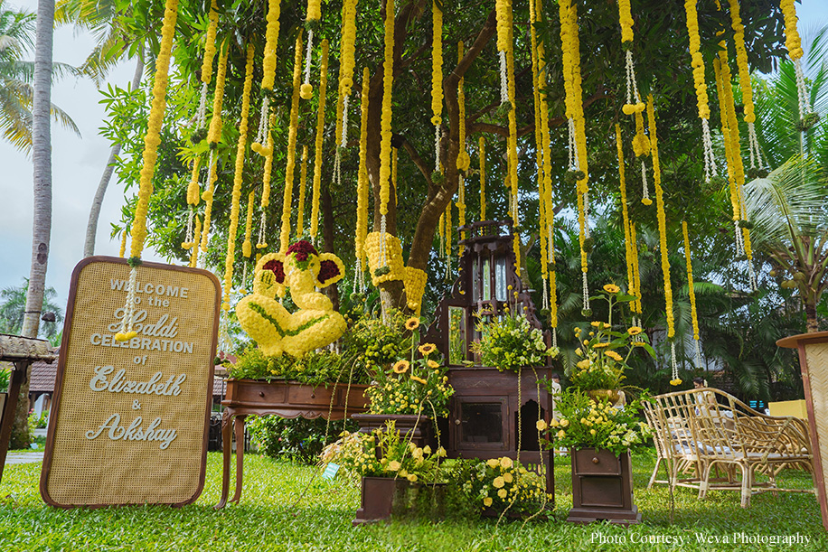 The next morning began with a traditional Haldi ceremony, imbibed with Kerala-inspired decor and details to honor the groom’s heritage. Imagined in a palette of yellow, white, and green, the decor featured traditional flowers and cane furniture for an authentic local feel. Kathakali, King Mahabali and his lady assistants (Thozhis), and Shingarimelam drummers welcomed the guests as they walked in. As the groom made his entrance under an ‘Ola Kuda’ escorted Shingarimelam team, the bride arrived in a traditional boat before being escorted in by a procession of ladies holding the traditional Kerala ‘thalams’. The event started with a ‘Ganga Aarti’ that was done by 7 pandits on the backwaters of the resort. This was a special moment as it was a surprise for everyone and left the crowd mesmerized.
