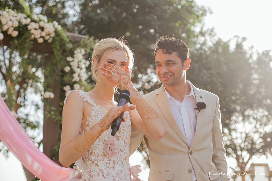 Talking about the inspirations that went behind planning this ceremony, bride Ellina says, “We wanted to have both our cultures integrated into the wedding. Instead of opting for a classic Christian or a Hindu wedding, we took traditions from both cultures that we felt most connected with. The theme was colourful but soft. The idea behind having different functions was to give enough time to people from both cultures to connect with each other and have fun.”
