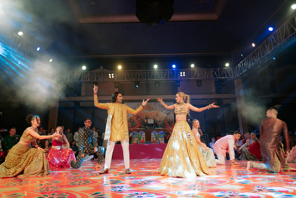 A colorful printed dancefloor and flashing lights set everyone in the mood to shake their leg at the sangeet. In true Gujarati style, everyone also performed garba and dandiya! Fun games ensured everyone was well-engaged while energetic Bollywood music even had the American guests cooking up a storm on the dance floor.