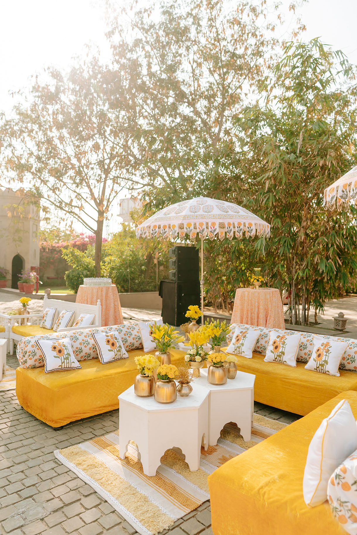 Set against the venue’s earthy architectural backdrop, the yellow hues of the haldi ceremony looked striking. Yellow blooms, sanganeri-printed bolsters and parasols along with gold vases brimming with blooms were included in the decor.