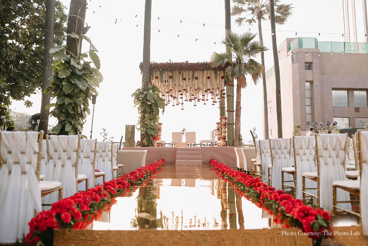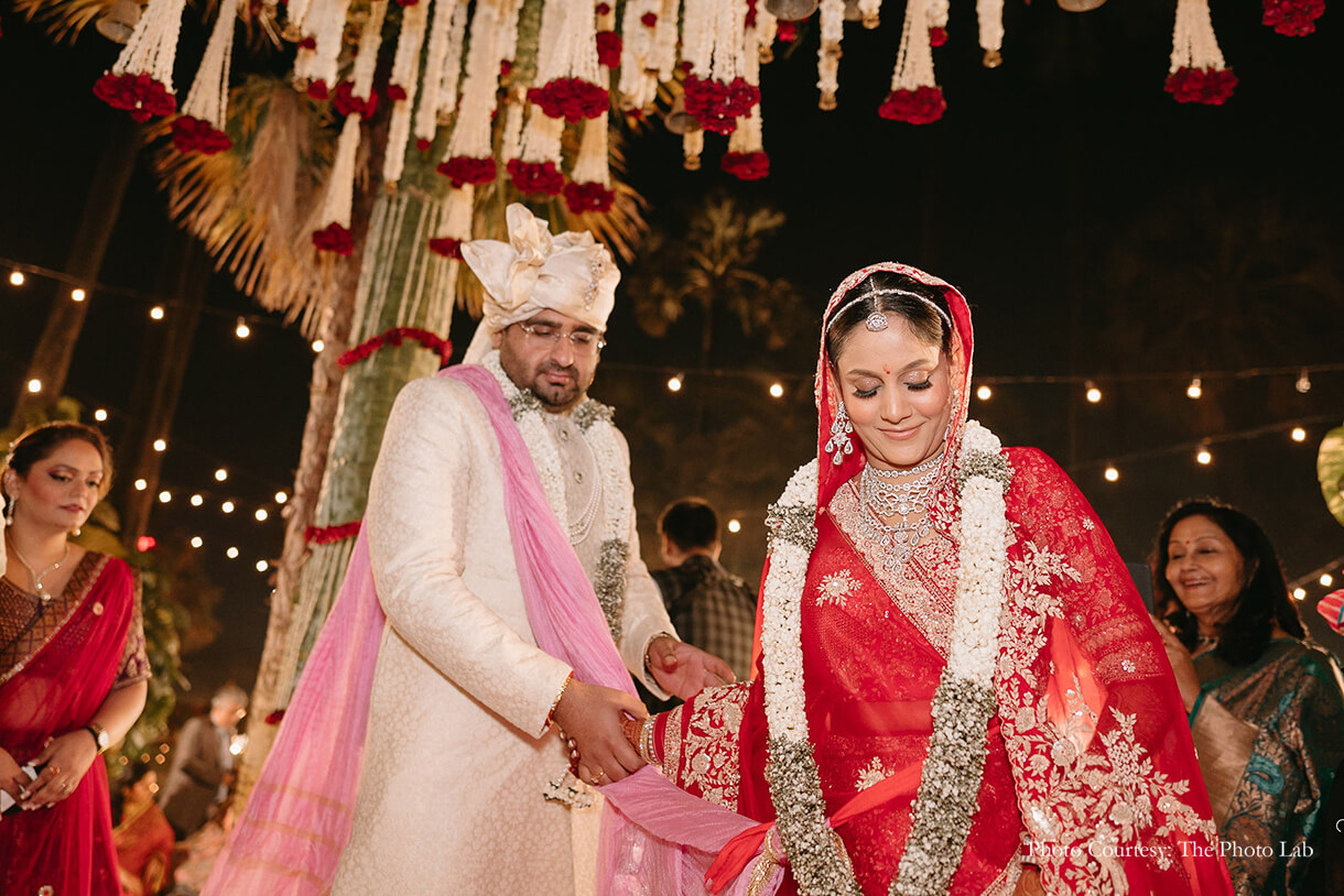 Easy, breezy and decorated with minimalistic floral elements in shades of red and white, the poolside open-air wedding was breathtaking. Fringed by palm trees, the mandap exuded a rustic look while fairy lights lit up the surrounding lawn.