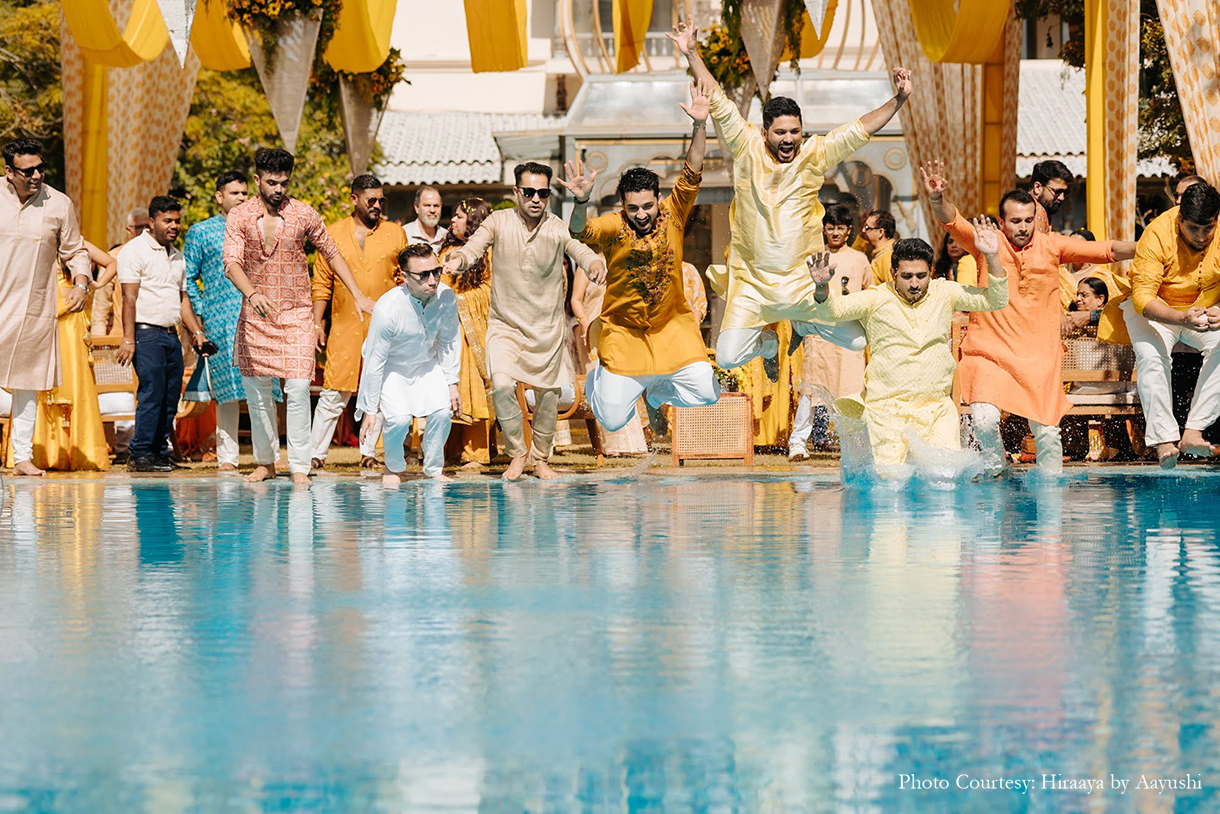 “For the haldi, it had to be sunflowers everywhere, till your eyes can reach! There was a huge tree at the venue and we used that as our backdrop for the bride and groom seating. There were rattan baskets with sunflowers filled in them suspended from the tree which made for most stunning pictures. Even the furniture was all rattan and the chairs had beautiful sunflower detailing on them. Given the venue was by the pool, everyone had a gala time taking a dip in it after haldi was done”, shared Feny.