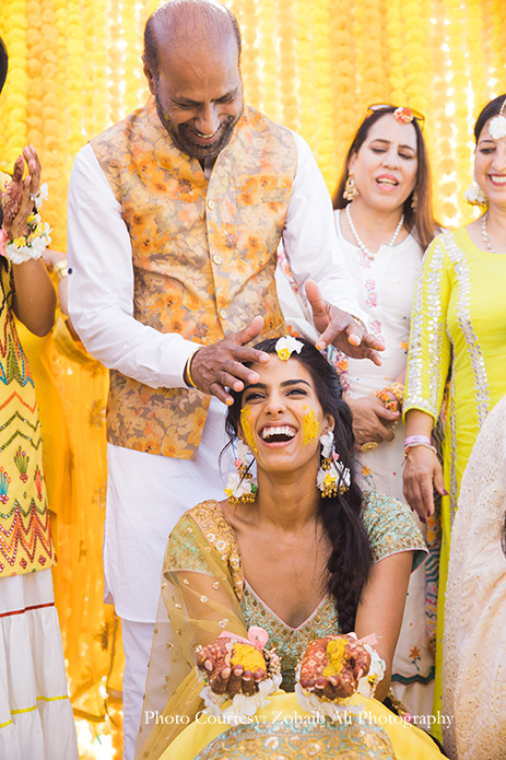 The next day commenced with a cheerful, sunny haldi ceremony. The couple’s friends and family surrounded them as they doused them in turmeric paste amidst a whole lot of love and laughter.