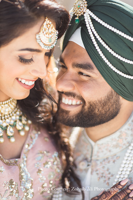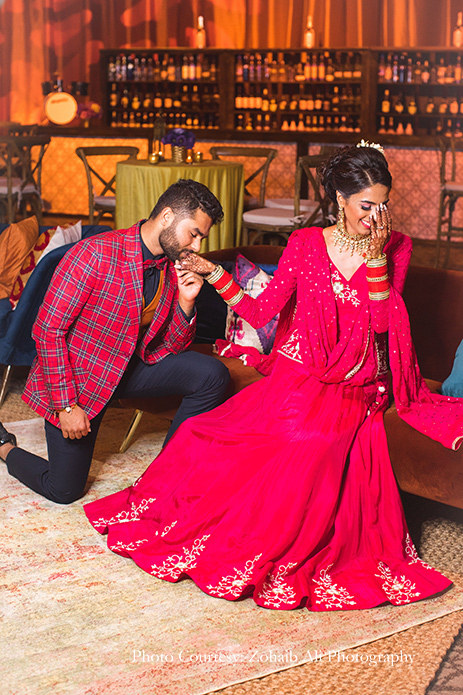 The bride shares, “Akaash and I met in 2011 at Northeastern University in Boston, in the Northeastern Bhangra dance team, with him eventually becoming my captain a few months later. We became good friends, and eventually co-captains. Things changed however when he graduated and invited everyone for a party to California. Despite being hesitant, living on the opposite coast, and already having prior travel plans, I decided to go. It was on my return flight, that I felt the pangs of emotions, and texted him my feelings. On landing, when I nervously switched on my phone, I was delighted to see that he felt the same way. Frequent conversation evolved into love and a long distance relationship for 3 years.”