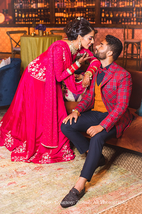 Inspired by the groom’s love for Bollywood, the Sangeet was themed on the iconic movie Om Shanti Om, and encouraged guests to dress up as their favorite movie characters for the night. Movie posters were put up with couple’s faces, a marketplace of fun goodies and street food stalls were setup for the guests to enjoy. Wearing the iconic pink outfit and plaid suit of Deepika and Shah Rukh, the couple entered replicating the premiere scene from the movie, and the guests were delighted by a video of the couple recreating the Dhoom Tana song. The couple’s college and post-grad dance friends came together to create one epic Bhangra performance. The friends and family performances were followed by one last dance by the couple on ‘You are my Soniya’ from Kabhi Khushi Kabhi Gham. Jaz Dhami then came on and had everyone grooving till morning.