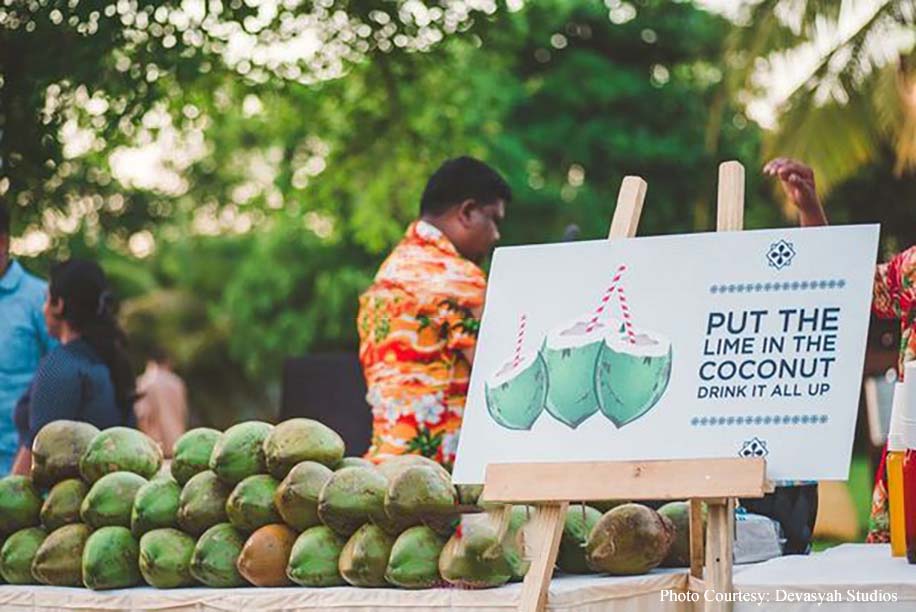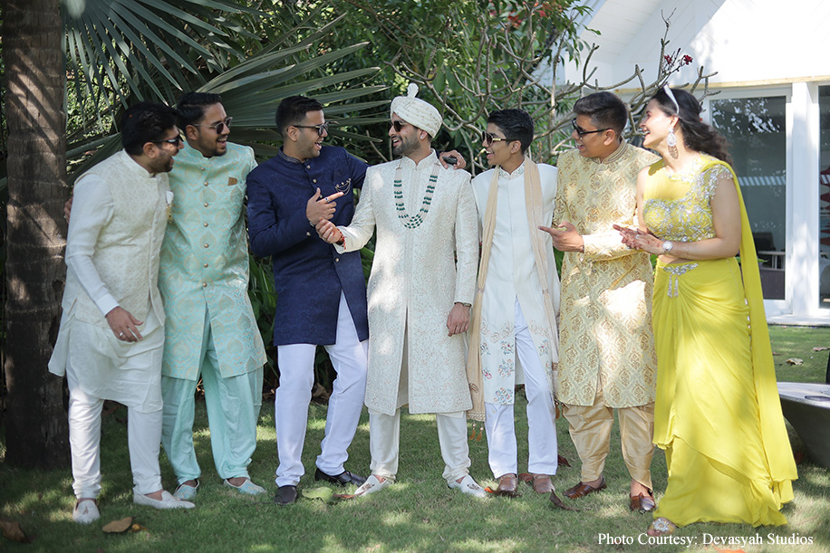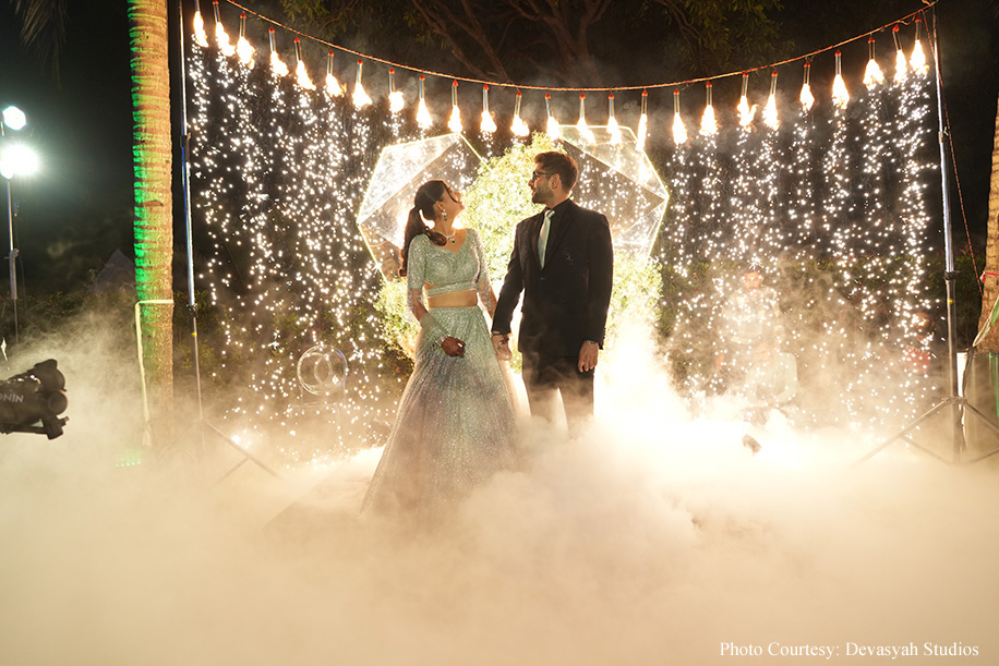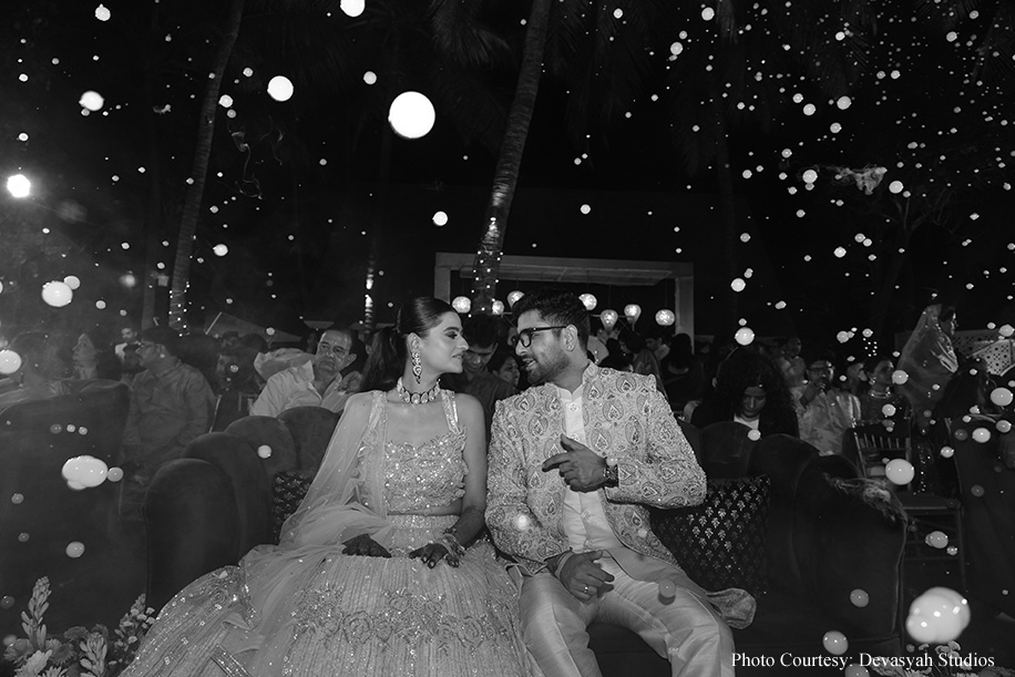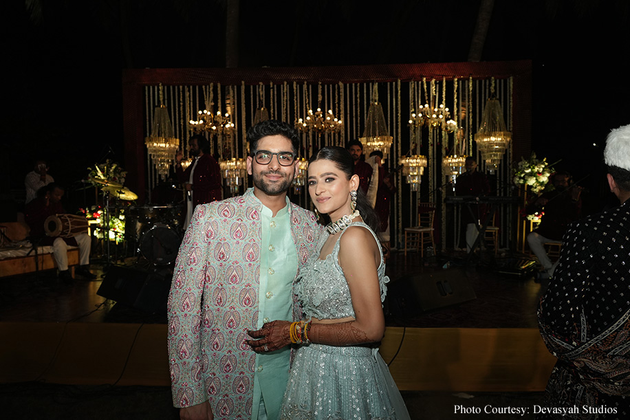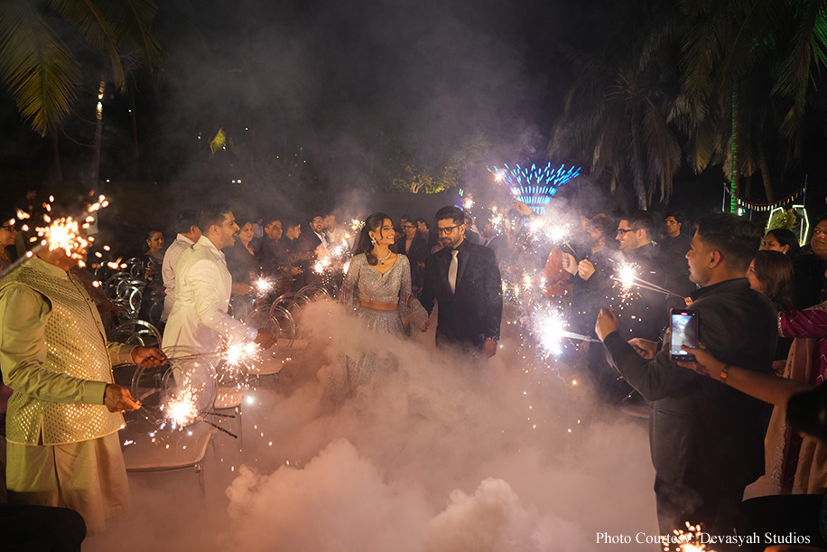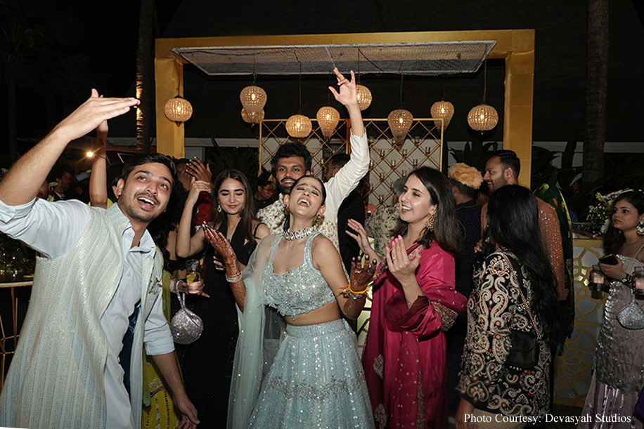 The wedding ceremony itself was a serene sundowner event by the beach, featuring minimalist decor that perfectly complemented the natural beauty of the surroundings. The waves of the water and the peaceful atmosphere created an enchanting setting, while the sitar symphony added a touch of musical elegance. The couple exchanged varmala on a beautifully decorated stage, at the end of which a burst of colors shot into the air, creating a magical moment! The celebrations continued with a grand dinner at the Rock Pool, where guests enjoyed a sumptuous feast under the starlit sky. The evening culminated in an after-party, ensuring the festivities carried on into the night.