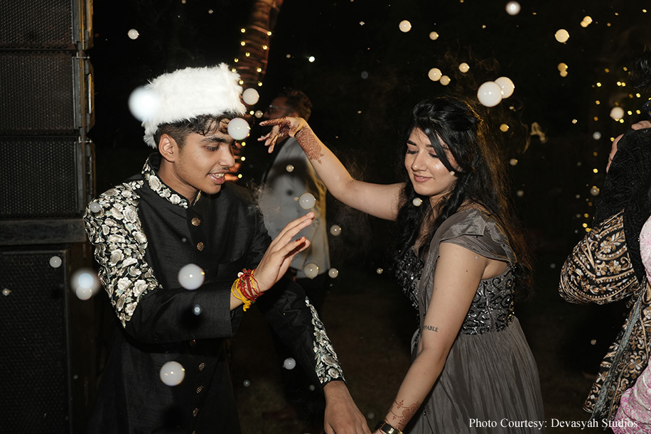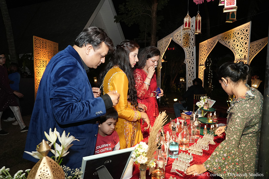 The Mehndi ceremony commenced with a cultural procession, transitioning into an enchanting Sufi night as the evening progressed. The decor featured a Moroccan theme, adorned with chandeliers, intricate floral arrangements, and rich hues of red. The highlight of the evening was the smoke bubble special effects, adding a whimsical touch. Guests were delighted by the perfume bar, where they could customize their fragrances, enhancing the sensory experience of the night.