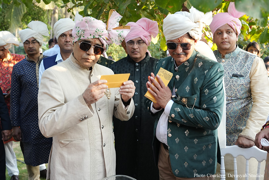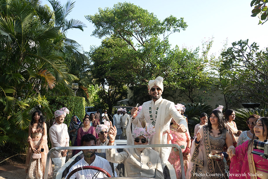Kicking off the wedding festivities, the baraat procession was a spectacle of enthusiasm, with the groom making a grand entrance in a vintage car. The baraat traveled along the picturesque landscape of Goa to the helipad where the wedding was going to be held. The guests’ energy and excitement were palpable, setting a jubilant tone for the wedding ceremony.